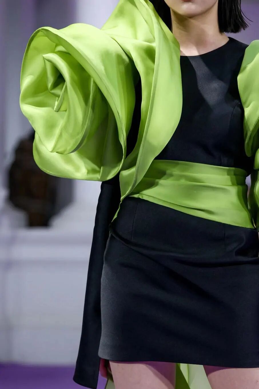 大尺寸花朵通常具有非常瞩目的效果,极具强大的气场表现力。Beautyberry品牌将完整的花朵造型于礼服之上,用立裁还原花朵绽放形态,体现礼服的力量与气势,或是截取花朵结构糅合服装袖、肩等基础构成,与服装廓形结合,热情奔放的花朵以“致敬工作者”。