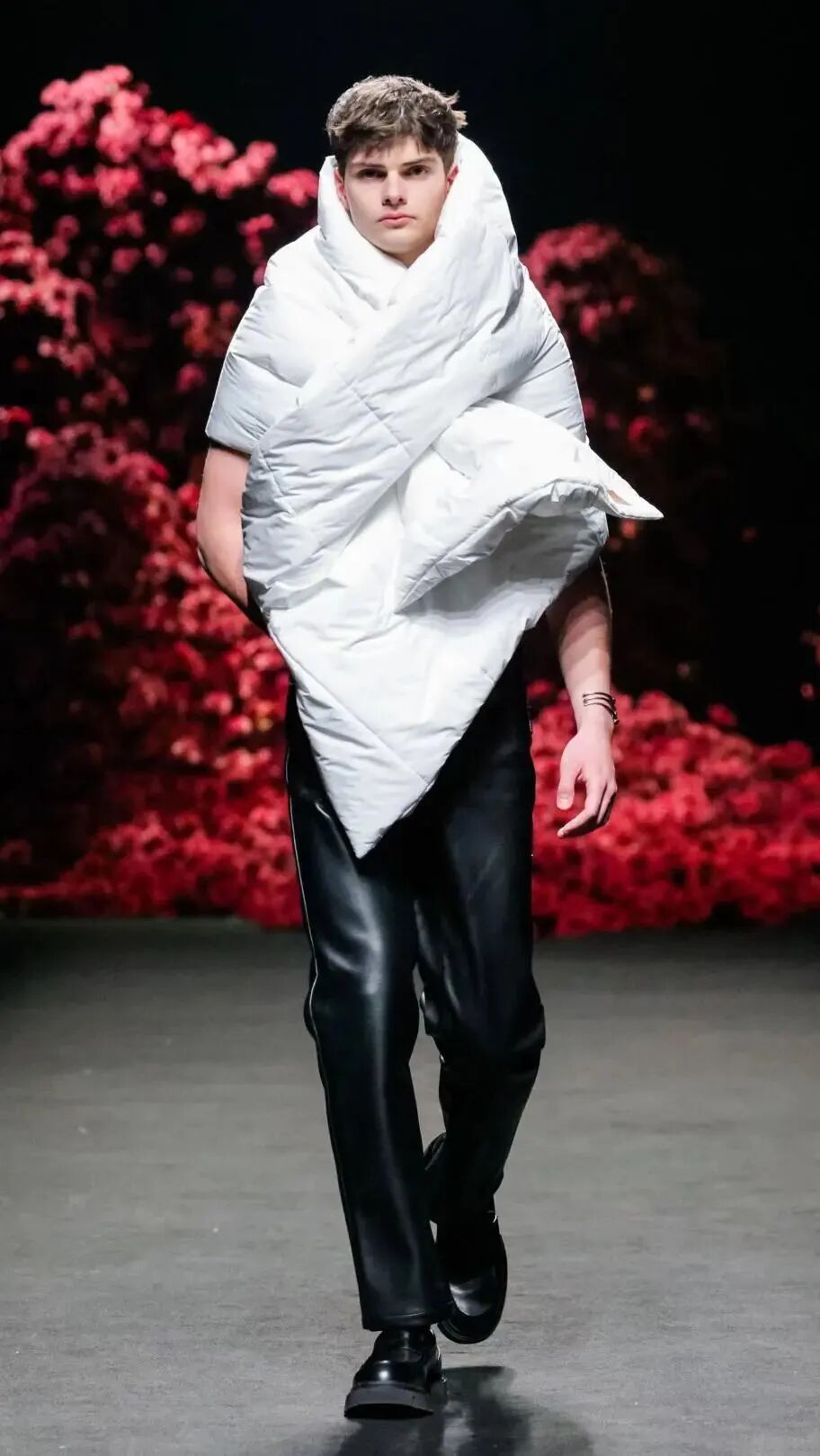 ZICKNESS本季发布系列“梦游者”依然沿着“如何通过一件单品打破沉闷”这一角度探索,交叉设计,非常规格的充绒披挂将头与肩紧紧包裹,漫不经心地用时尚语言体现“梦游者”的安枕与慵懒,仿佛梦境中并不沉闷的幻想。今日青年的充绒披挂设计得更为蓬松,加入织带、立体口袋、金属拉锁等元素,层次分明且立体,更具有后朋克时装装饰性。