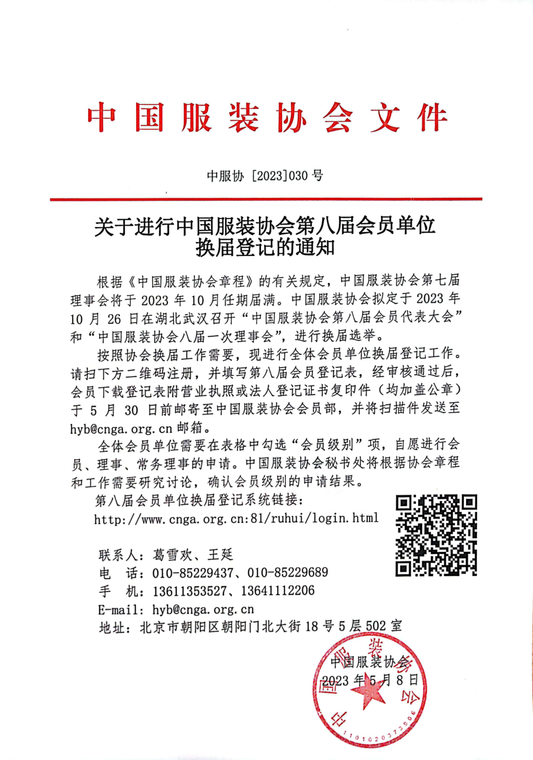 根据《中国服装协会章程》的有关规定,中国服装协会第七届理事会将于2023年10月任期届满。中国服装协会拟定于2023年10月26日在湖北武汉召开“中国服装协会第八届会员代表大会”和“中国服装协会八届一次理事会”,进行换届选举。