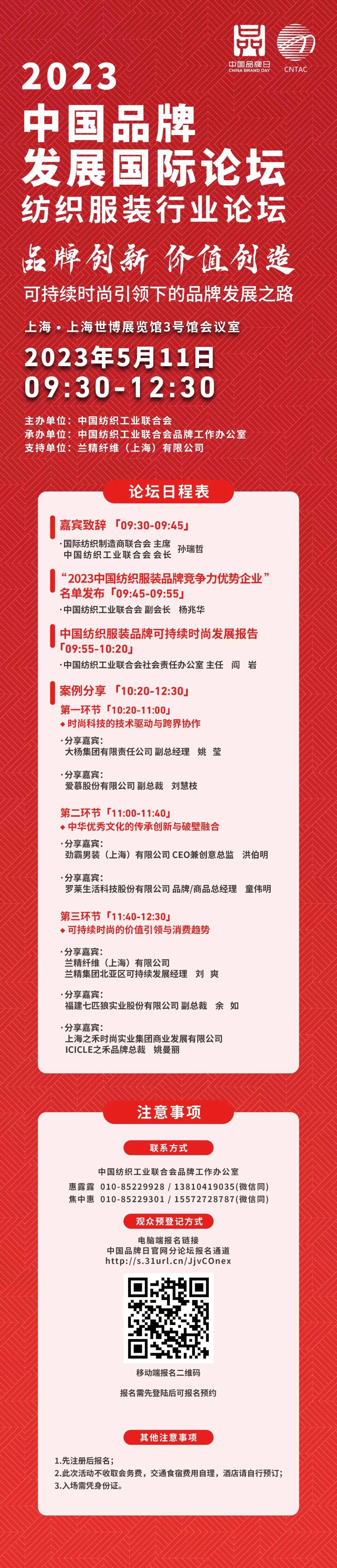 作为中国品牌日官方系列活动,“2023 中国品牌国际发展论坛——纺织服装行业论坛”将于5月11日上午在上海世博展览馆举行,交流碰撞前沿思想,分享品牌价值建设成果。
