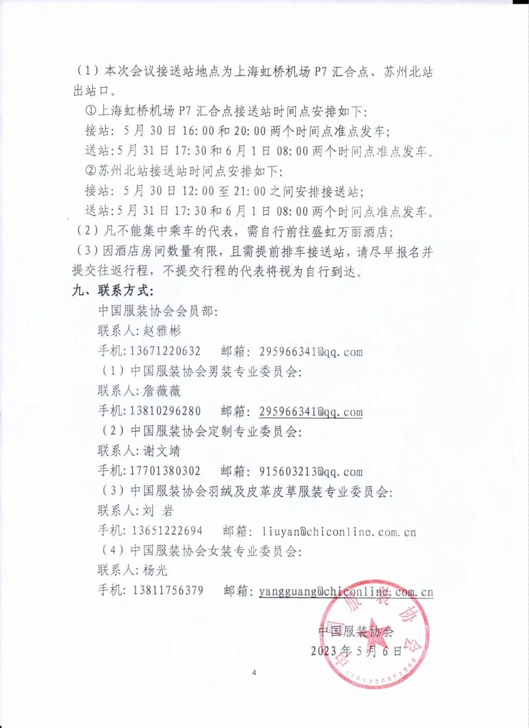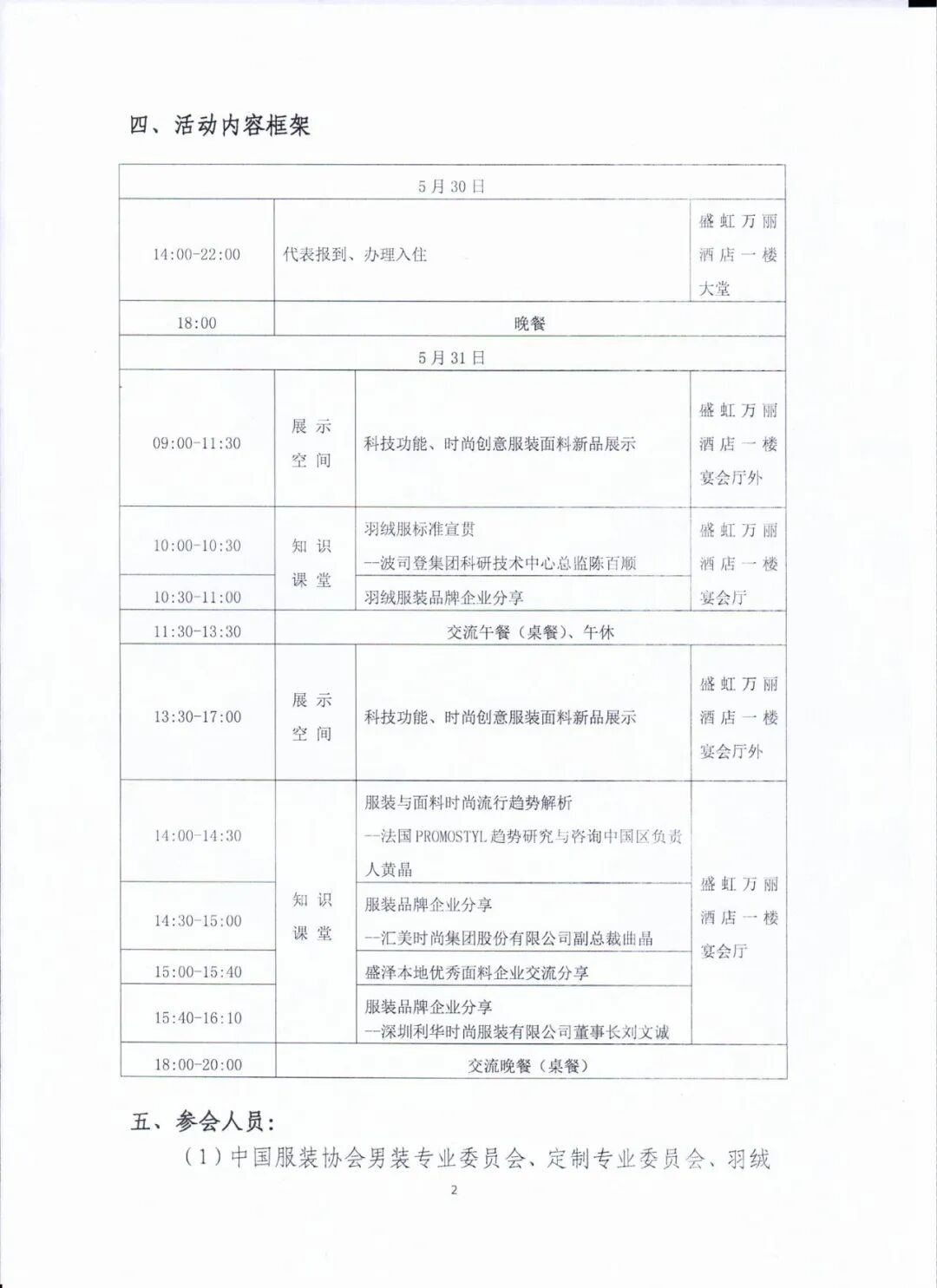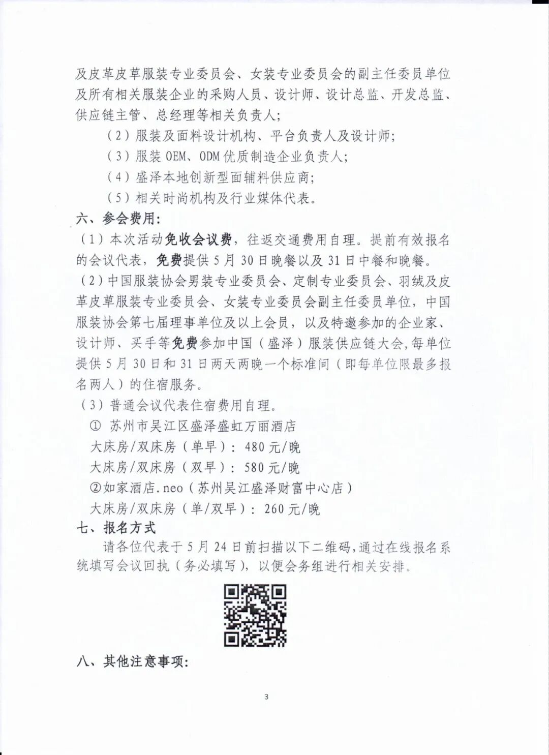 (2)中国服装协会男装专业委员会、定制专业委员会、羽绒及皮革皮草服装专业委员会、女装专业委员会副主任委员单位,中国服装协会第七届理事单位及以上会员,以及特邀参加的企业家、设计师、买手等免费参加中国(盛泽)服装供应链新品展示对接会,每单位提供5月30日和31日两天两晚一个标准间(即每单位限最多报名两人)的住宿服务。