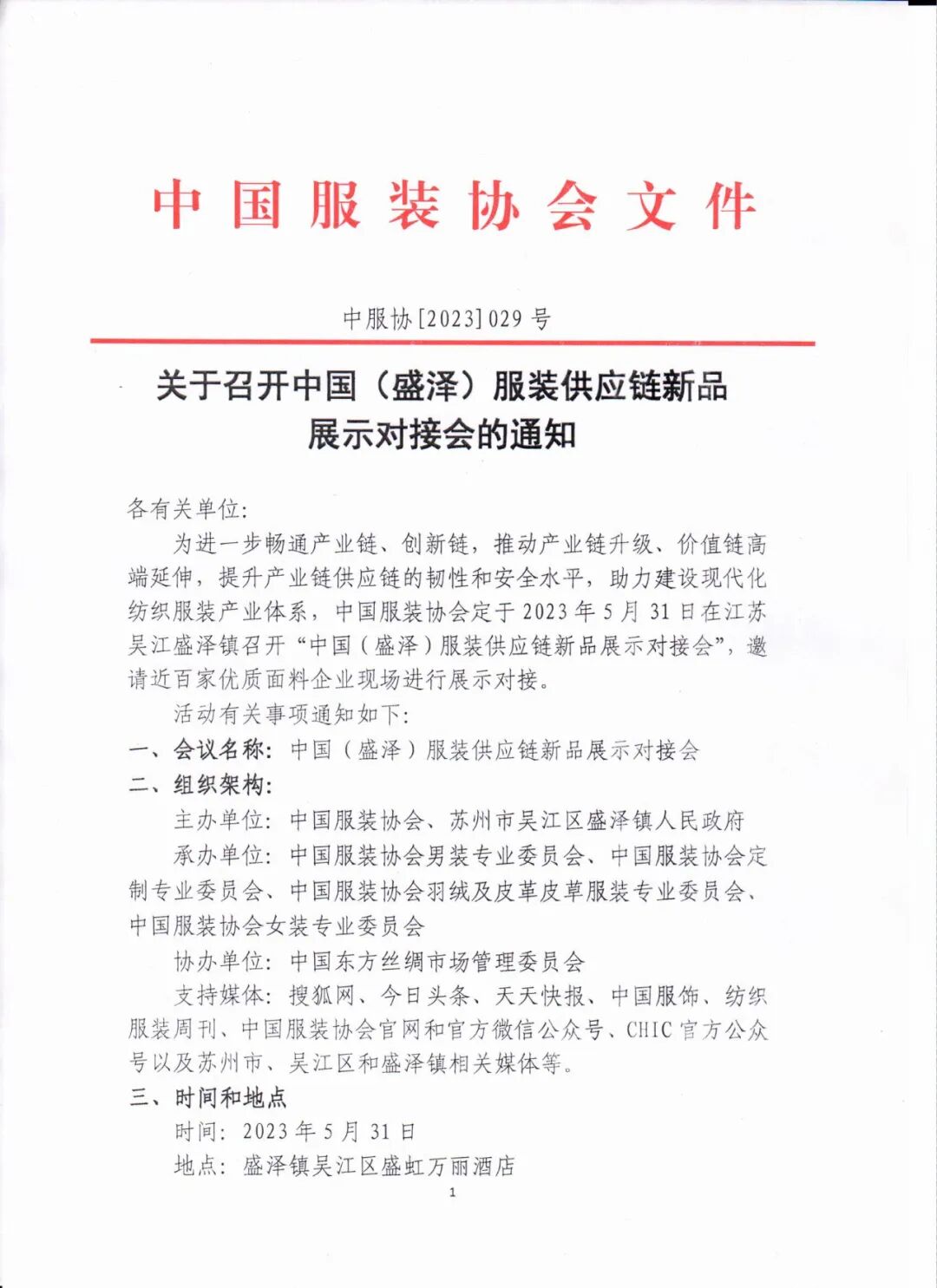 为进一步畅通产业链、创新链,推动产业链升级、价值链高端延伸,提升产业链供应链的韧性和安全水平,助力建设现代化纺织服装产业体系,中国服装协会定于2023年5月31日在江苏吴江盛泽镇召开“中国(盛泽)服装供应链新品展示对接会”,邀请近百家优质面料企业现场进行展示对接。