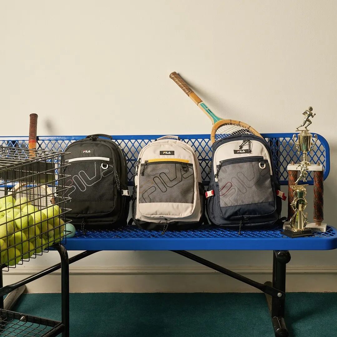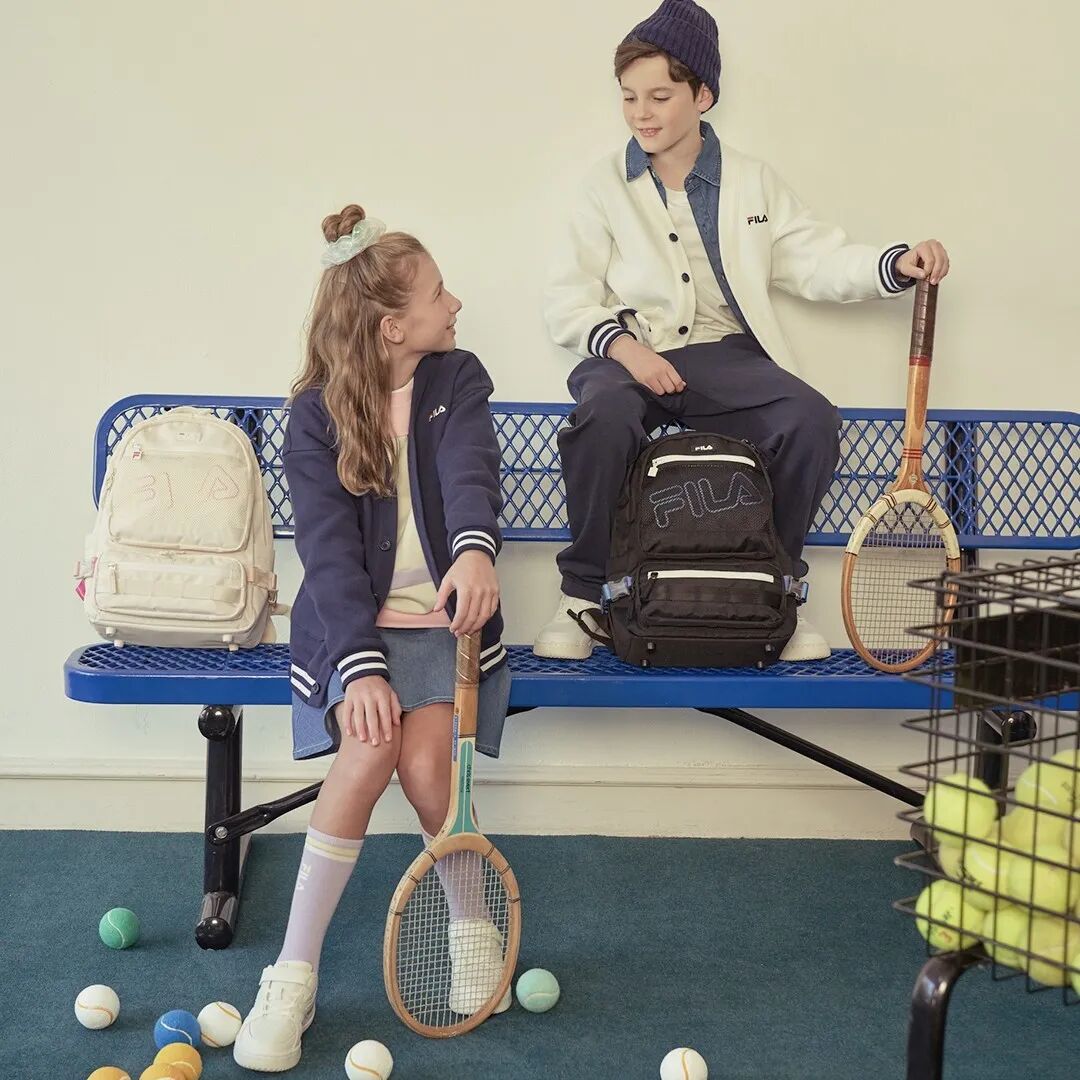 FILA Kids 2023开学季杂志以网球为主题,介绍了从尼龙夹克到打球配饰的商业单品,如条纹袜和吸汗带。
