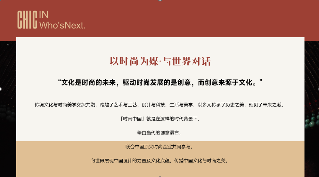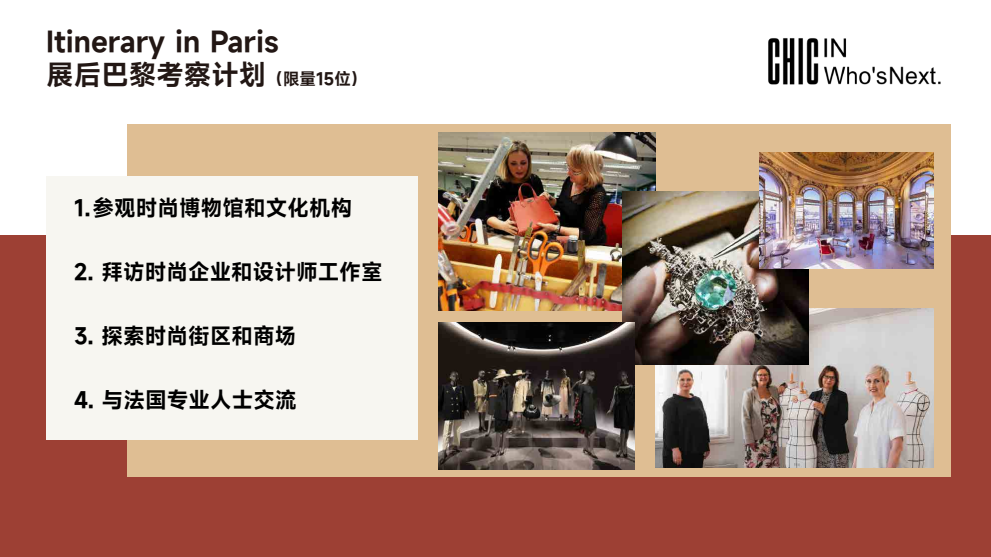 在中国式现代化建设新征程全面开启的背景下,中国时尚产业韧性成长,进入了高质量发展的转型关键期。围绕构建时尚产业新发展格局,响应国内国际双循环的战略发展要求,为推动产业高水平对外开放,CHIC将带领代表中国文化价值及中国时尚设计能力的服装服饰品牌与设计师,共赴欧洲时尚之都——巴黎,通过组织优秀的中国品牌及设计师参加Who’s Next及与当地知名品牌与时尚机构展开深度交流活动,向世界展现中国设计的力量及文化底蕴,传播中国文化与时尚之美,加速推动中国时尚的国际化进程。