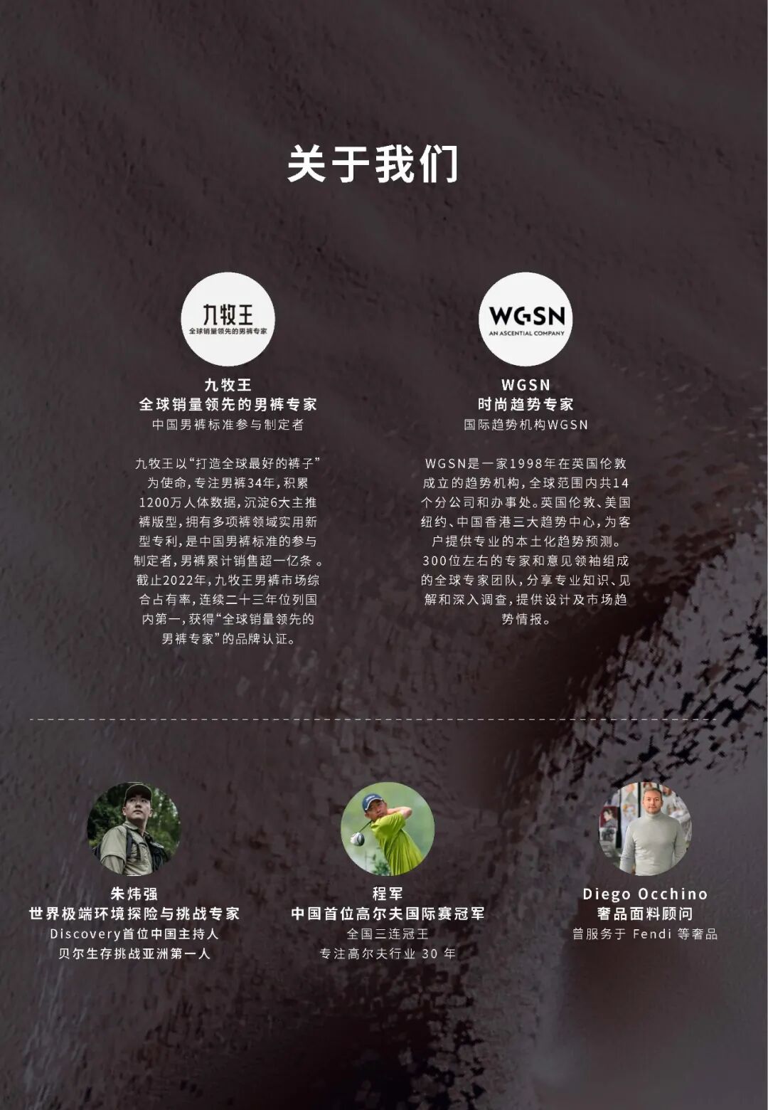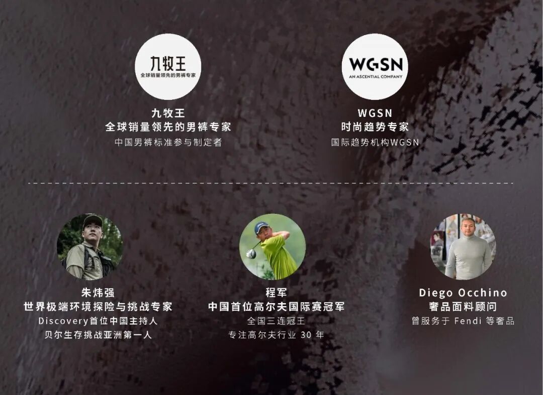 WGSN一直以来都在关注消费者生活方式变化以及流行趋势的动向,并追踪户外场景下,人们着装需求和穿搭方式的变化。WGSN观测到当下的消费者更渴望能带来舒适、优质、轻盈、专业防护体感的产品。男裤专家九牧王多年来一直深耕裤装领域,立足商务认知,敏感洞察到消费者生活方式变化对户外运动专业功能的需求,因而联合时尚趋势专家WGSN、世界极端环境探险与挑战专家朱炜强、中国首位高尔夫国际赛冠军程军、奢品面料顾问Diego Occhino,五大专家共同研发,推出“九牧王商务户外1号裤”。创新“三超三防”科技面料,拥有“超轻超弹超透汽,防皱防晒防小雨”的功能特点,解决用户在商务与户外双场景下的痛点问题,以期带给用户更好的商务户外生活体验。