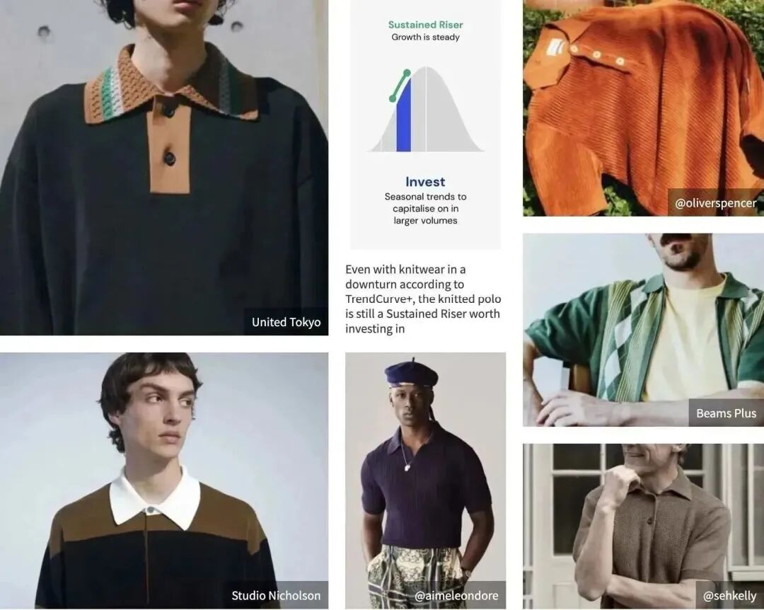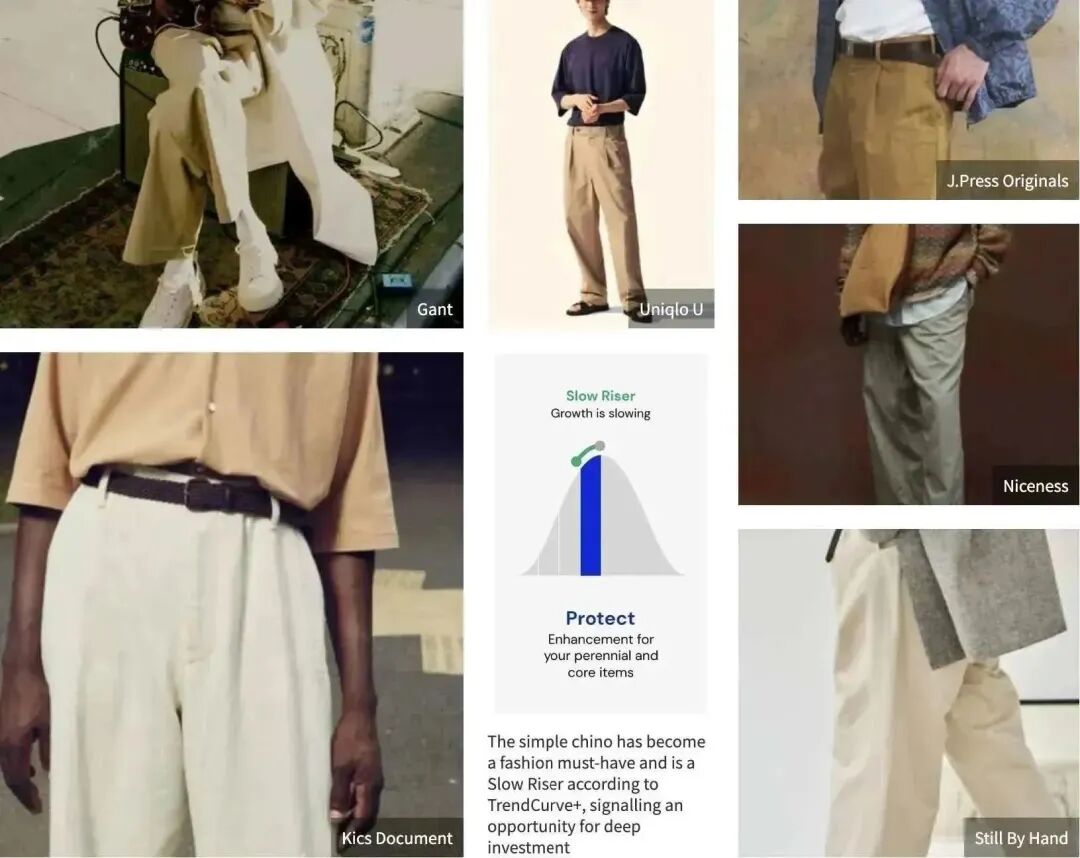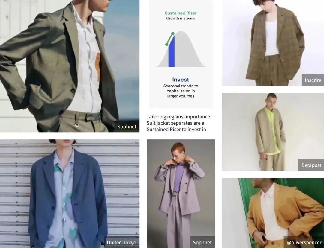 WGSN通过Trend Curve+数据追踪到面向中高端市场的商务以及商务休闲风男装单品越来越受欢迎,人们希望通过更专业的着装来彰显自身的专业性,从而获得更好的工作。男西装、舒适休闲西裤等单品都呈上升趋势。