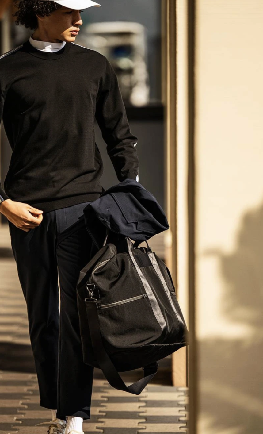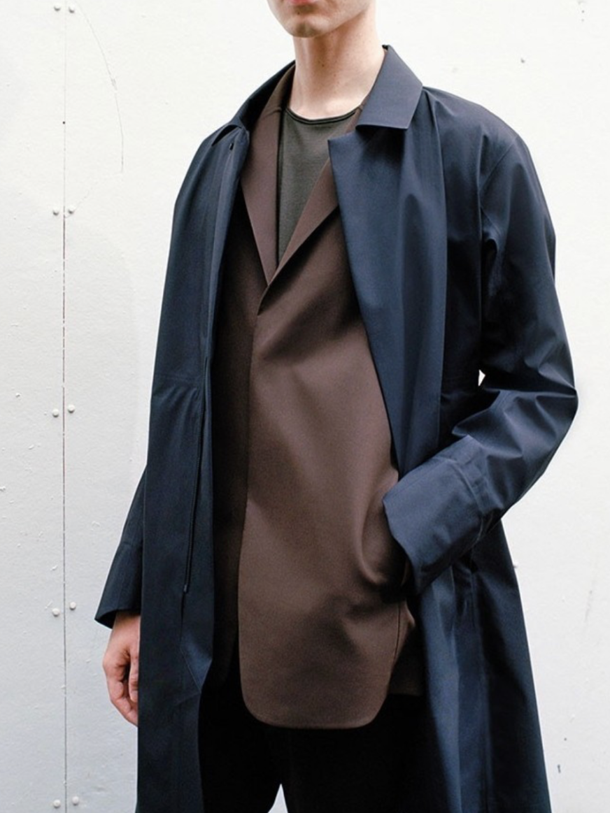 纸质触感的面料、打蜡涂层、环保尼龙,以及功能性防风防水科技面料与正装风单品的结合,是点睛之笔,保持穿着者考究优雅气质的同时兼顾了户外功能性需求。