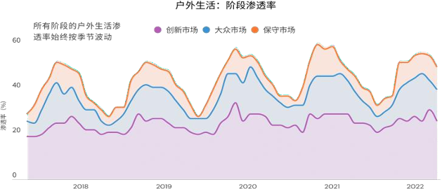 WGSN趋势走势图显示从2018年到2022 年期间,创新市场、大众市场、保守市场的户外生活渗透率始终按季节波动,其中大众市场和保守市场渗透率相对更高。