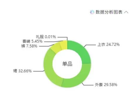 根据POP数据分析,蝶绿及其相近色在裙装品类的使用中占比最高,其中又以连衣裙为主要单品,占比高达78.34%;其次是外套;西装外套和夹克外套在外套中为重点单品,占比分别为17.4%和27.4%。