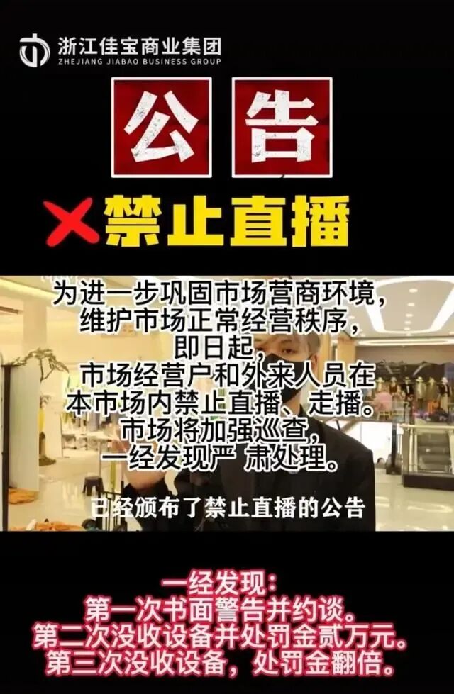 今年3月,常青休闲女装批发市场(以下简称“常青市场”)官方抖音发布一则公告,禁止商户和外来人员直播、走播,一经发现,第一次书面警告并约谈,第二次没收设备并处罚金贰万元,第三次没收设备,处罚金翻倍。