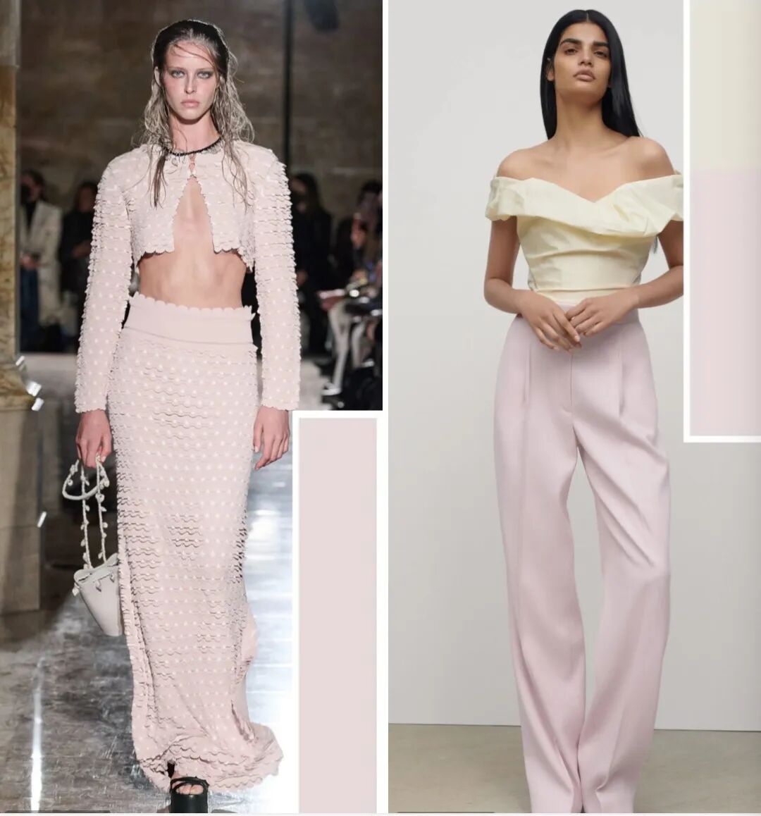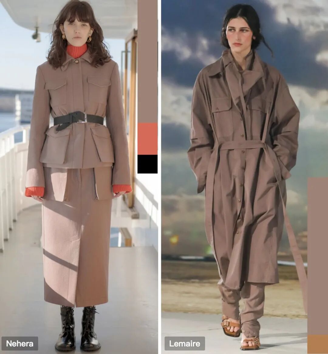 用晨光粉来塑造柔美且具有个性的粉蜡色外观,或搭配橡木棕的拼接、焦橄榄色的单品穿搭,尽显现代风范。局部点缀的橡木棕色让晨光粉单品带有一丝沉稳,搭配上橡木棕半裙收尾呼应的色彩穿搭方式让整体更显连贯性。