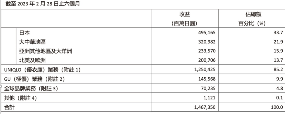 按地区划分,日本优衣库录得营收约4951亿日元(约合256亿人民币),同比增长 11.9%,报告期内日本市场的同店销售净额增长10%。经营利润则为 673 亿日元(约合35亿人民币)同比下降 1.6%,原因为去年下半年日元贬值导致成本上涨进而侵蚀利润。占比最大的是优衣库海外市场,录得总营收为 7552亿日元(约合390亿人民币)同比增长 27.3%;经营利润为1226亿日元(约合63亿人民币)同比增长 22.2%。尤其是东南亚、南亚及大洋洲地区、北美及欧洲(俄罗斯除外)均取得收益及经营溢利双双大幅增长。其中大中华区录得营收3209.82亿日元(约合166亿人民币),同比微增4.6%。但营收占比进一步下滑至21.9%,减少3.3个百分点。大中华地区是由于第一季度单季期内中国大陆受疫情影响,收益及溢利皆大幅下降所致。但2023年1月起,大中华区业绩已出现回升趋势,第二季度单季期内录得收益小幅下降而溢利大幅增长。在GU(极优)事业分部,报告期内收益总额为1455亿日元(约合75亿人民币),较上年度同期增长18.5%,经营溢利总额为130亿日元,同比增长39.2%。在全球品牌事业分部,报告期内收益总额为702亿日元(约合36亿人民币),较上年度同期增长19.1%,经营溢利总额为1亿日元,同比下降 85.3%。对于整个2023财年(截至2023年8月),迅销上调了的全年业绩预期,预计销售收入将增加16%,达到2.68万亿日元,营业利润将增加21%,达到3600亿日元,净利润将减少12%,降至2400亿日元。
