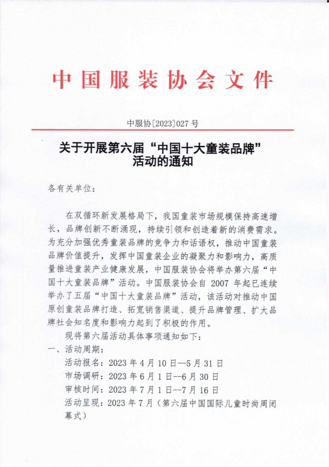 自2021年开始,“中国十大童装品牌”活动每二年开展一次。“中国十大童装品牌”称号有效期为二年。2023年公布的“中国十大童装品牌”称号有效期至2025年6月30日。