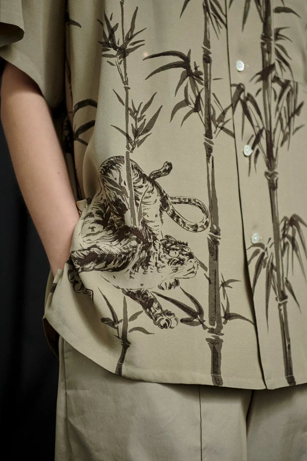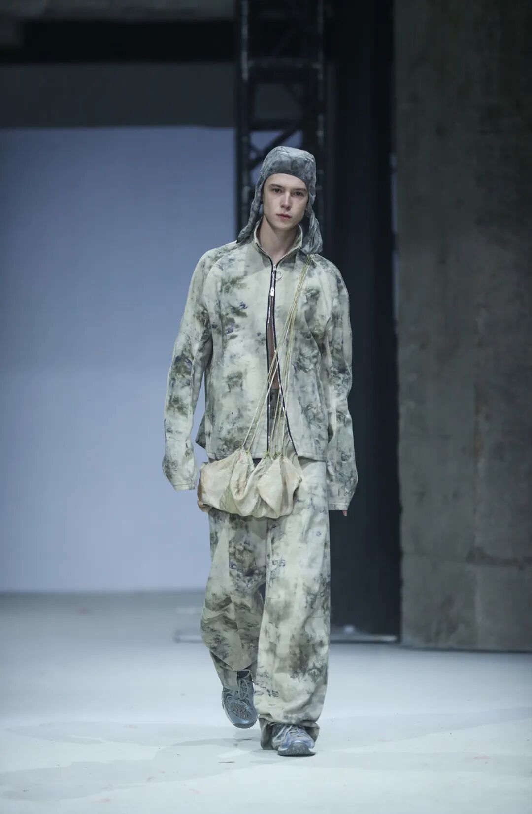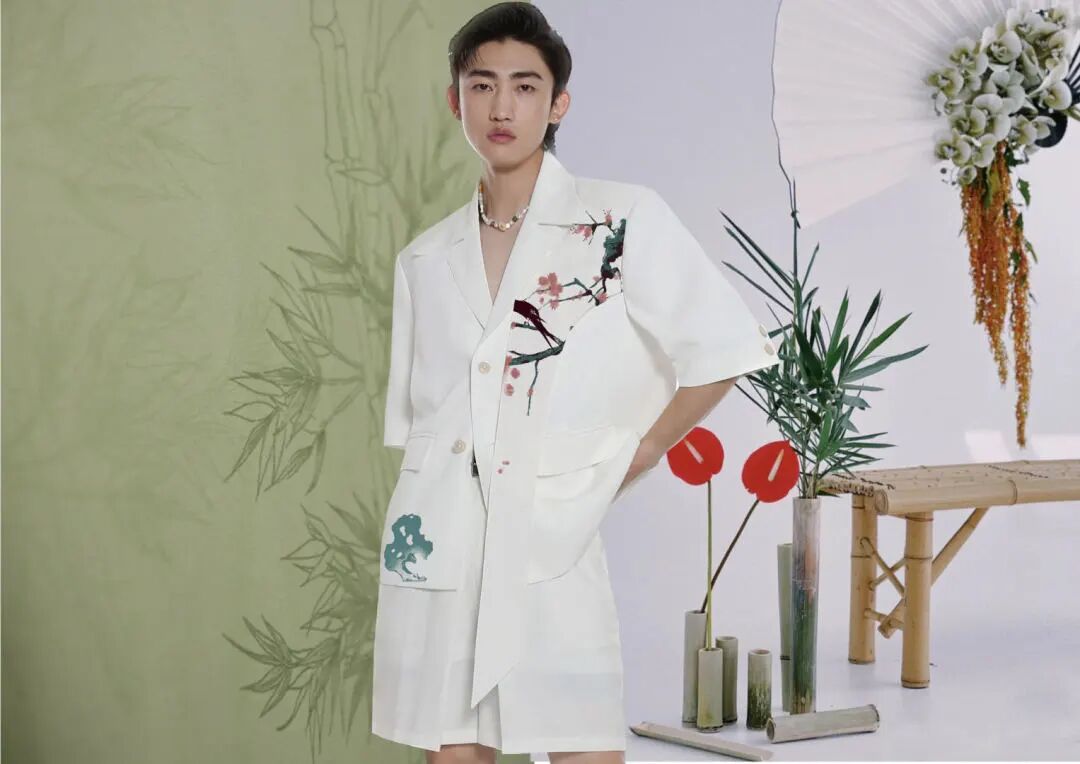 DEMO、Ms MIN、OLD JOE均以独幅或定位印花的形式将国风艺术画作直接运用在上衣单品上,前两者的用笔及配色相对活跃,更具中式“新”运用的生命力。山谷少年品牌则将传统花鸟以胸前刺绣的工艺运用在相对西式的衬衫上,兼具创意与美感。Peng Tai则是将抽象水墨图案运用于整身面料,视觉上洒脱舒适。