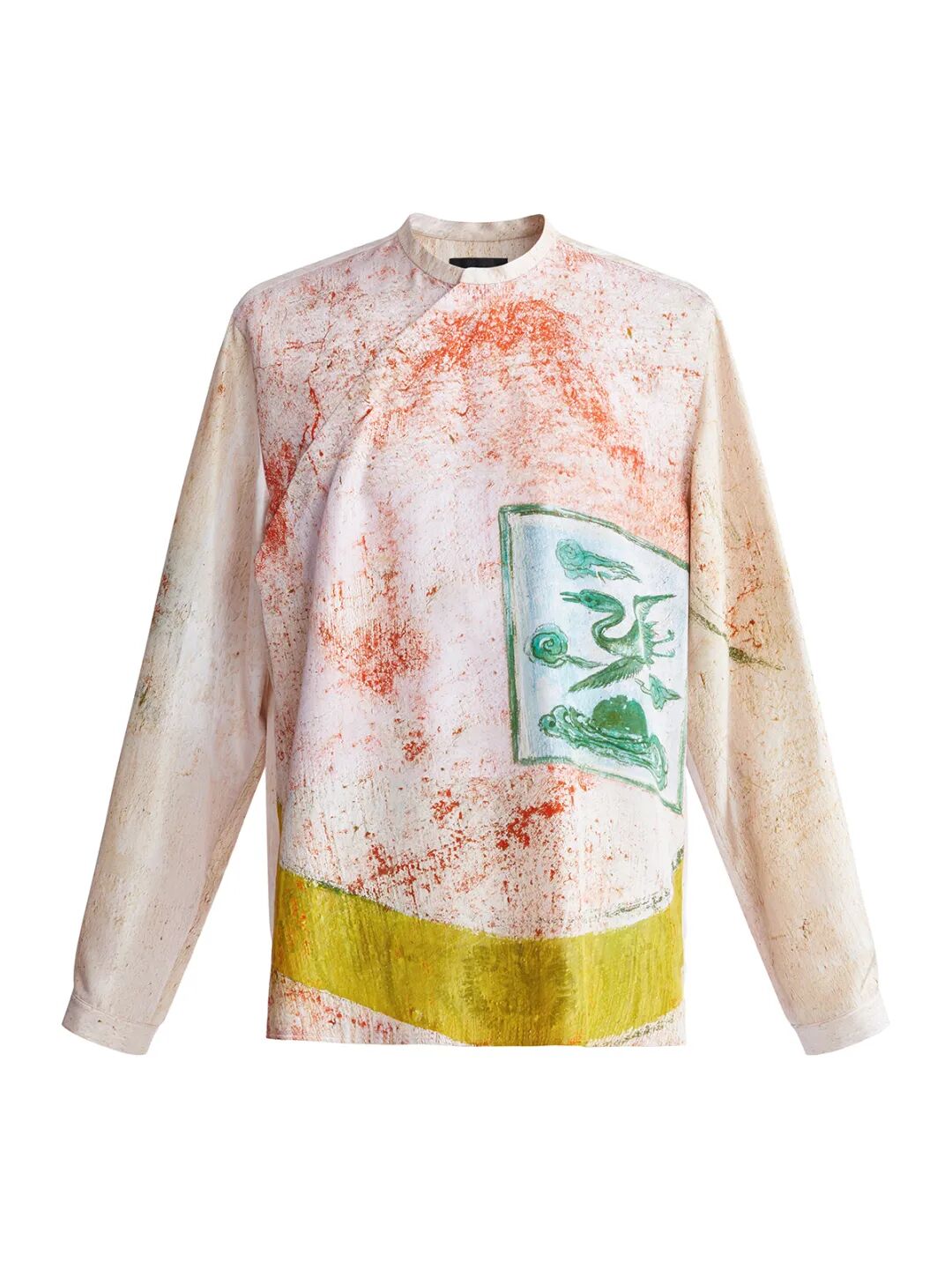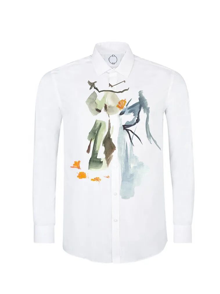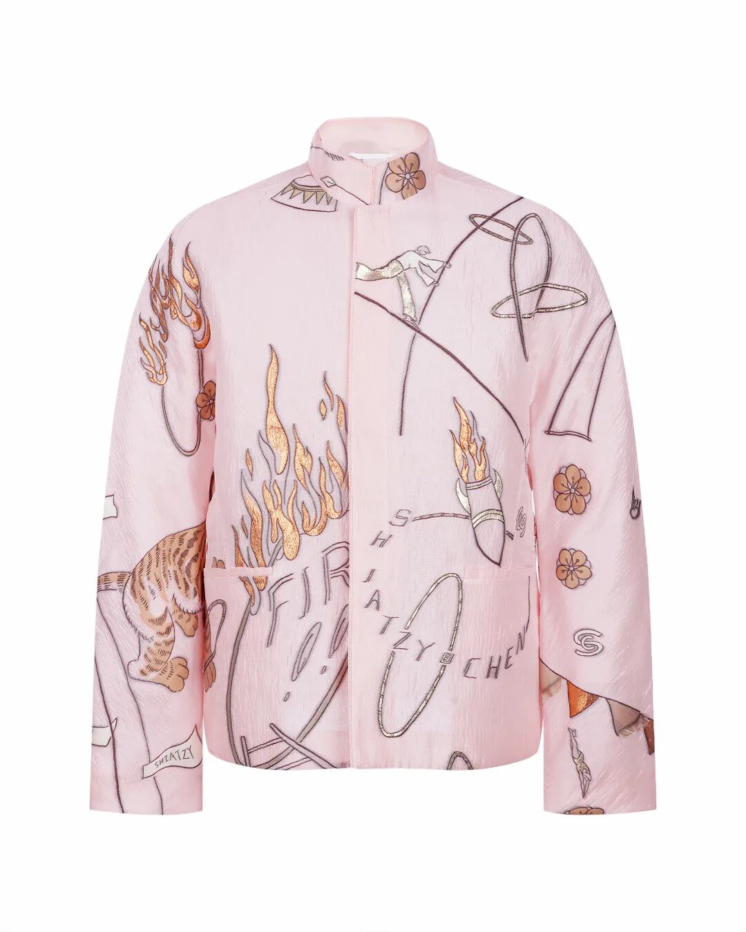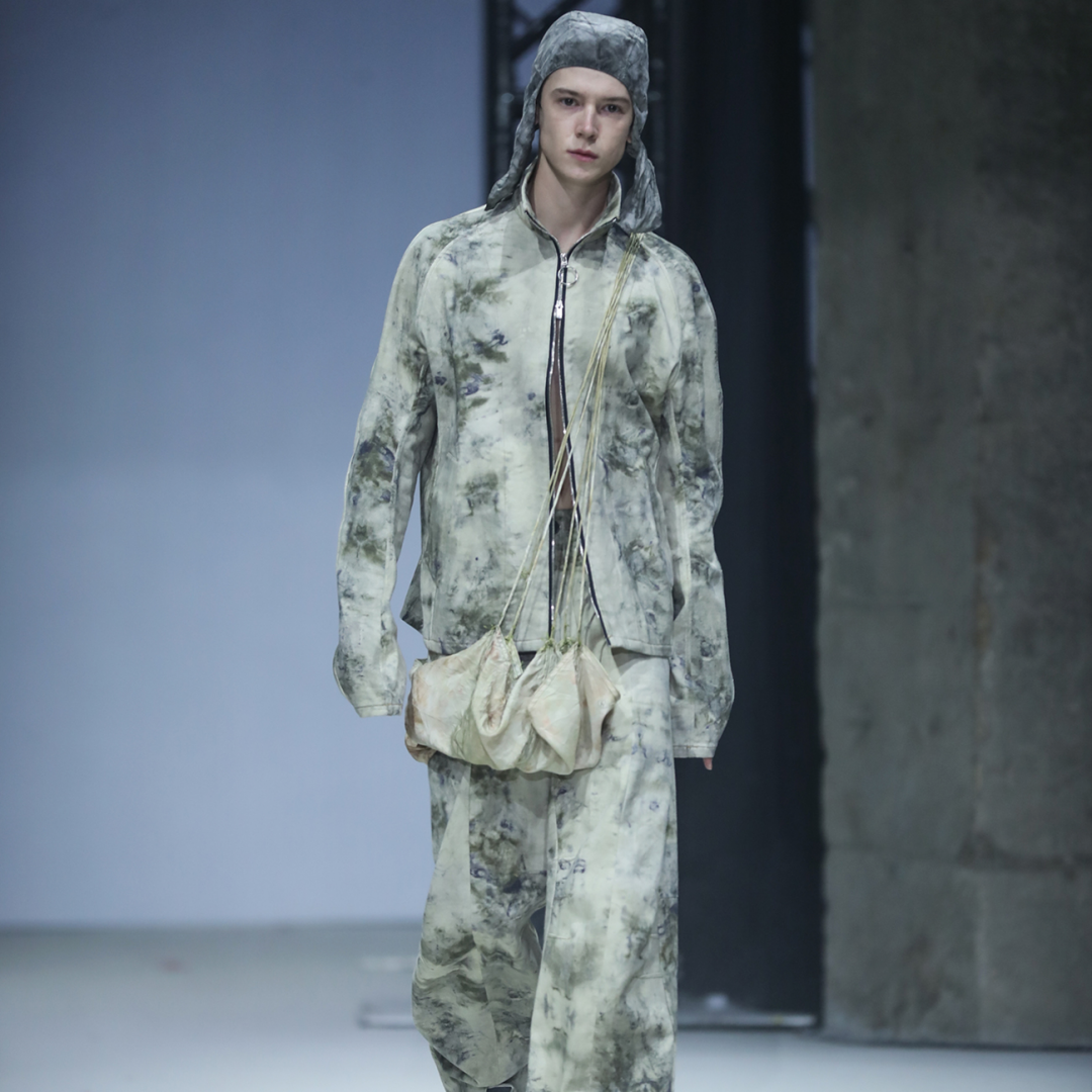 DEMO、Ms MIN、OLD JOE均以独幅或定位印花的形式将国风艺术画作直接运用在上衣单品上,前两者的用笔及配色相对活跃,更具中式“新”运用的生命力。山谷少年品牌则将传统花鸟以胸前刺绣的工艺运用在相对西式的衬衫上,兼具创意与美感。Peng Tai则是将抽象水墨图案运用于整身面料,视觉上洒脱舒适。
