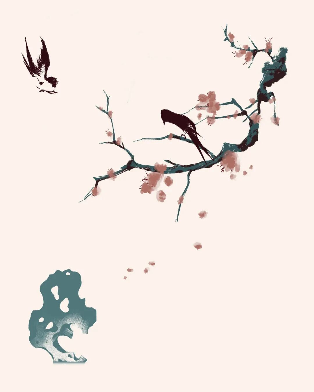 将经典的花鸟、竹叶元素以传统国画的艺术手法进行表达,同时配合氛围模糊、局部亮色点缀等方式实现中式“新”用。整体营造清朗、肆意的画面效果。