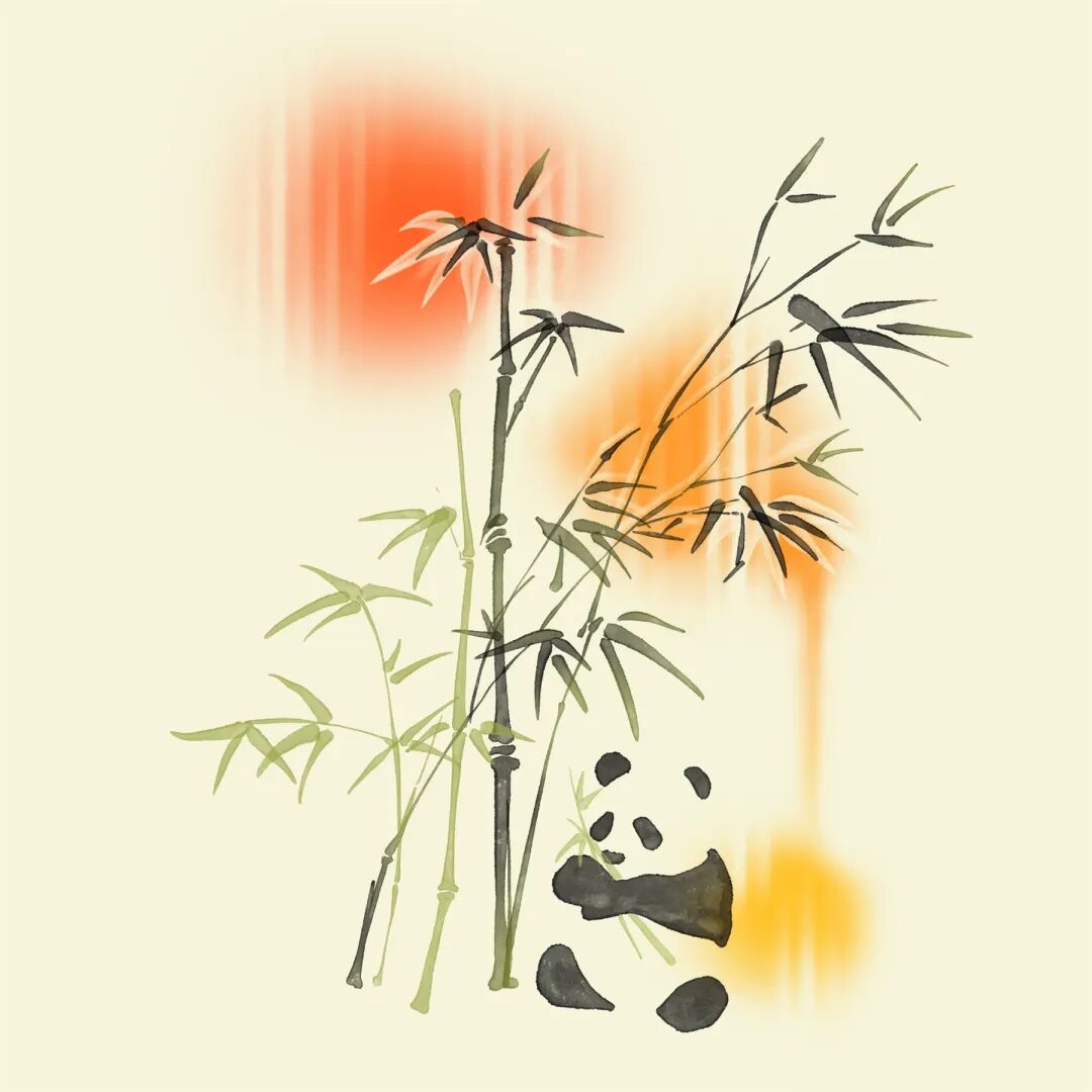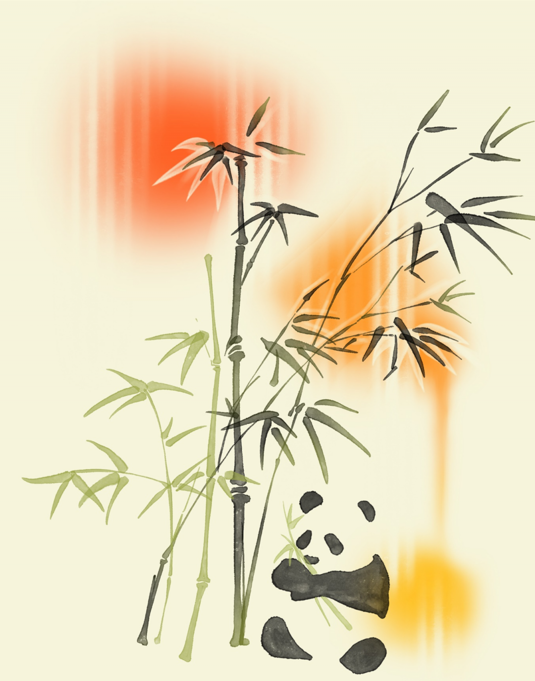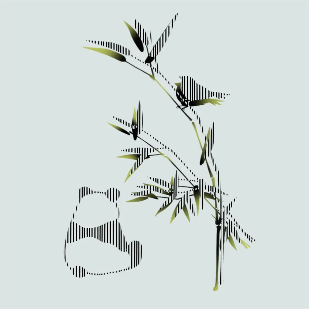 以竖向线条作为竹叶、花鸟、熊猫等元素的剪影填充,结合书法艺术展现新中式的历史韵味。该篇幅的图案更适合与刺绣工艺相结合,体现线条的层次感。
