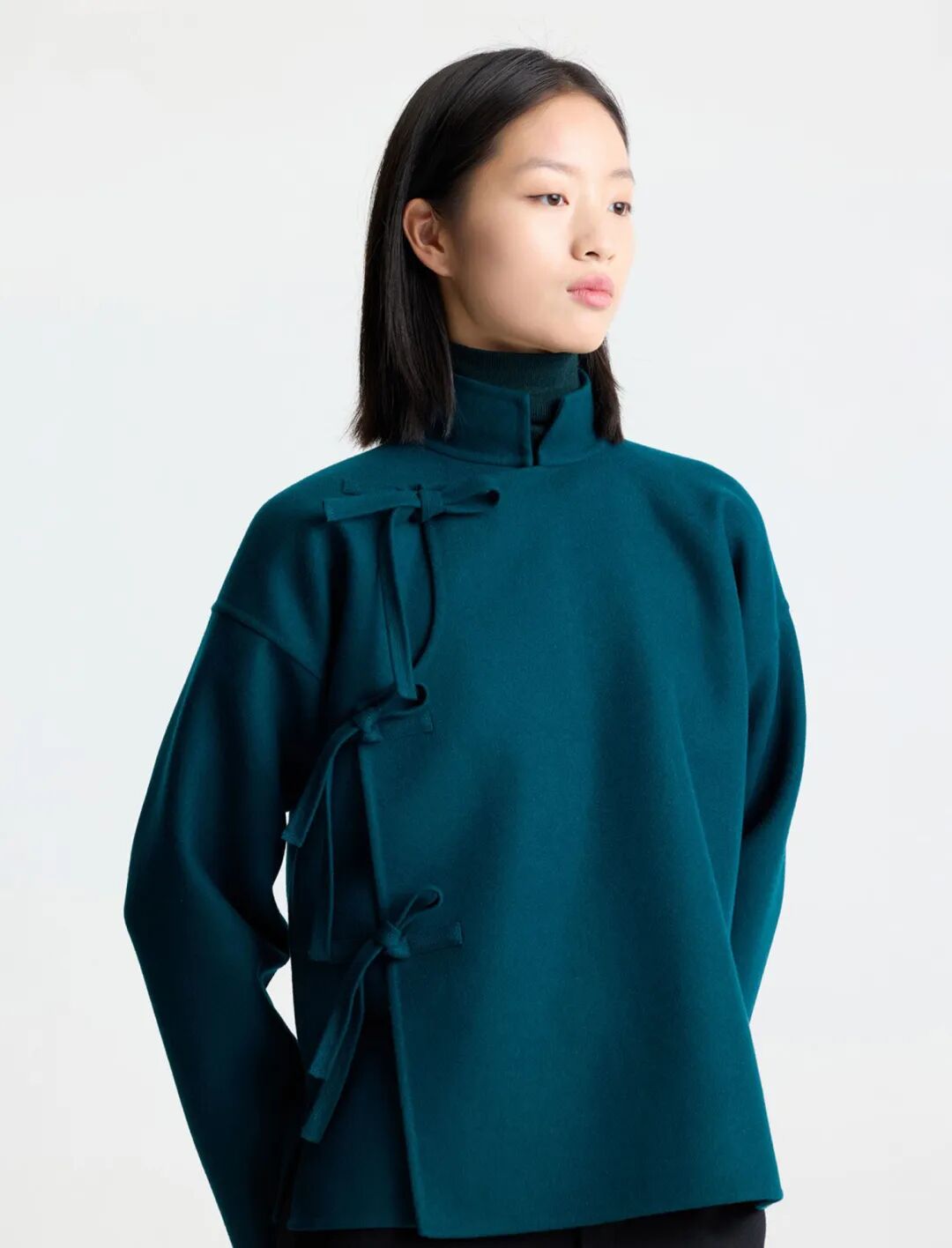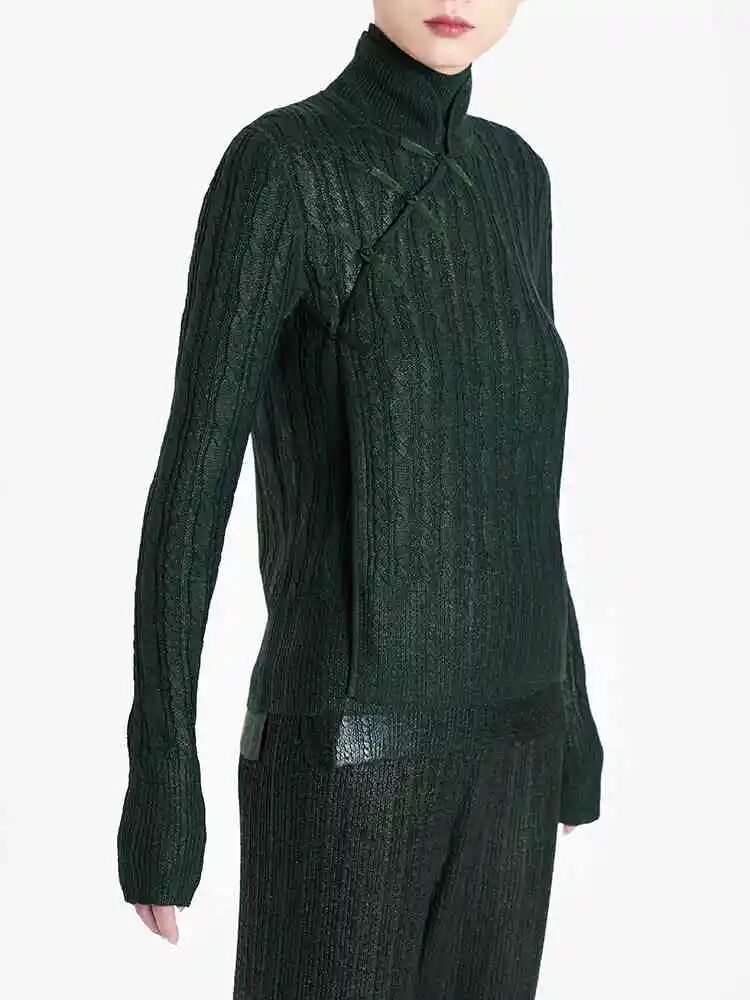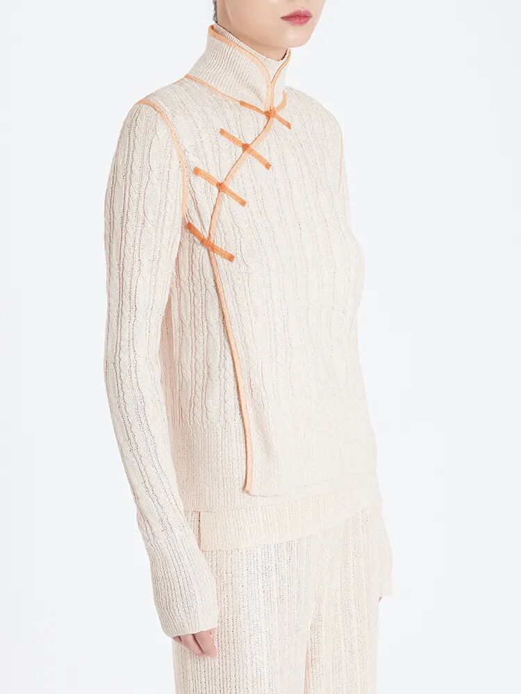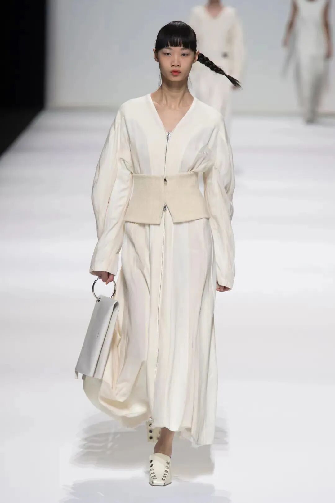 新式斜襟的设计通过结合圆弧边缘剪裁和纽扣装饰来体现新意,由不同弧度塑造的特色开襟加上盘扣的排列使斜襟的效果更加突出,可通过细节设计来对不对称的效果进行平衡。