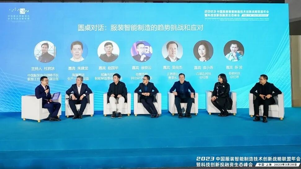 中国服装协会副秘书长兼科技部主任、联盟工作办公室副主任杜岩冰和中国服装科创研究院研发中心总监徐丙顺接力主持了本次年会的压轴议题——“服装智能制造的趋势挑战和应对”圆桌对话。大杨集团总经理胡冬梅、广东溢达数智工厂项目负责人肖风、杰克股份战略与投资管理部总经理李国策、瑞晟智能市场中心总监李洪雨、上海威士技术部经理狄金刚、海澜集团生产一中心总监朱建龙、报喜鸟控股智能制造事业部总监赵国华、劲霸男装科创研究部总监徐京云、上海富山董事长吴良杰、百琪迈科技总经理袁小燕、春晓科技总经理陈波作为对话嘉宾围绕共同话题各抒己见,展开了激烈讨论,从不同的视角,对智能制造工作的实践、经验、挑战展开了分享和研讨,同时提出了重点改善和优化的环节,并对联盟下一步的工作提出了期望和建议,在对话中碰撞出了意想不到的火花。