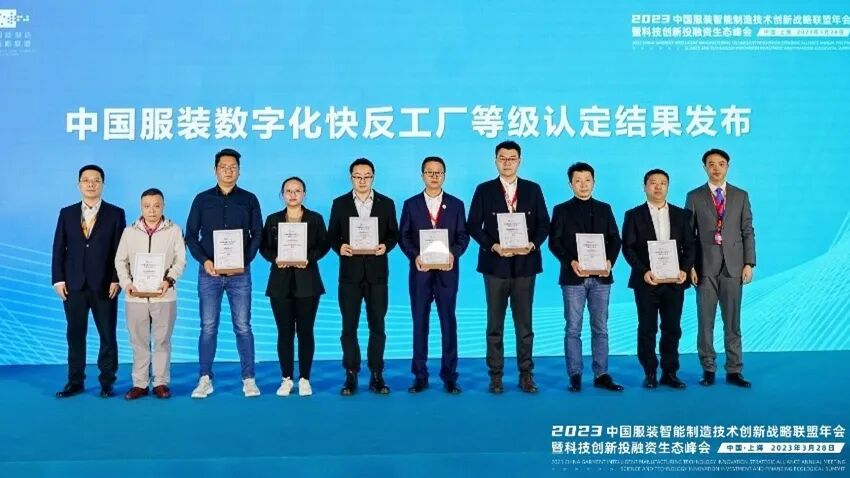 2022年12月,为全面推进服装行业数字化转型升级发展,引导和推动服装企业创新能力提升和数字化改造,促进服装行业高质量发展,中国服装协会在组织制定《中国服装数字化快反工厂等级认定工作管理办法(试行)》的基础上,成立了认定工作委员会、设立认定工作委员会办公室,正式启动中国服装数字化快反工厂等级认定工作。中国服装科创研究院作为认定工作的执行机构,在完成对相关企业的认定后,提交认定委员会已通过,正式形成对8家行业企业的认定结论,并在本次会议中正式发布。国家工业和信息化部消费品工业司纺织处副处长纵瑞龙,中国服装协会常务副会长、联盟工作办公室主任杨金纯现场为认定企业颁发了证书。