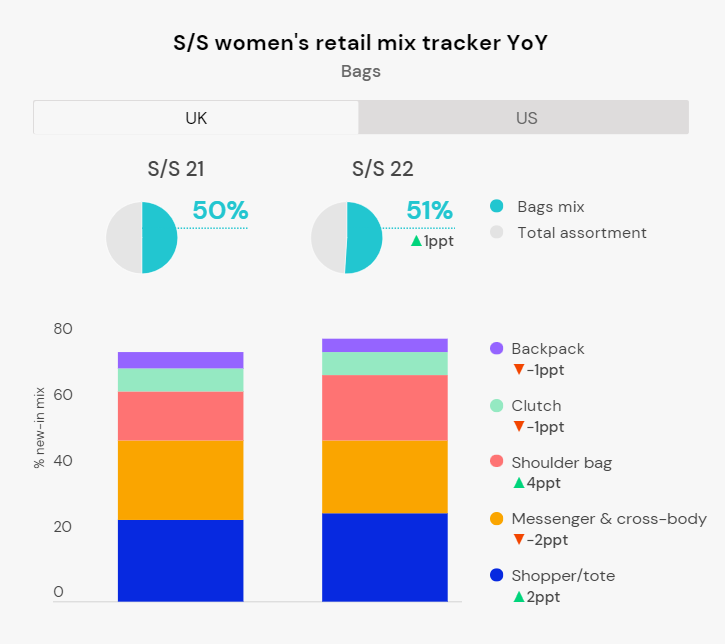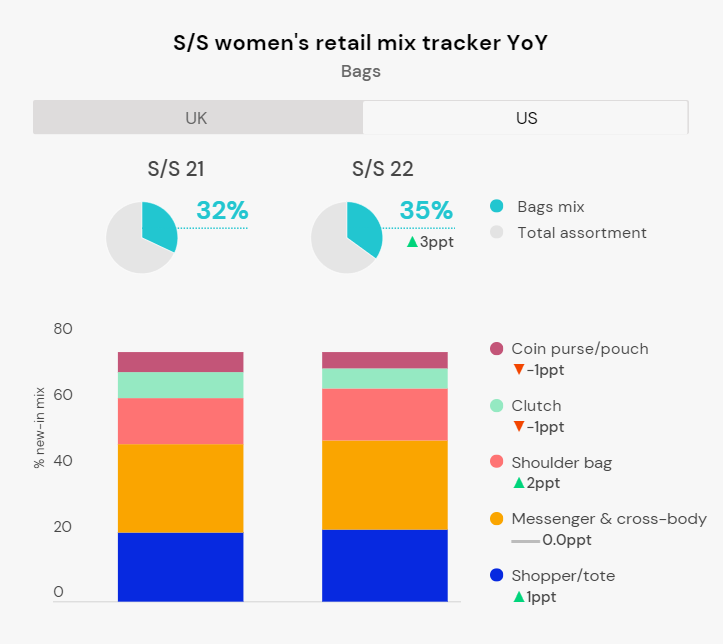 实用性是该品类的重要卖点,大手提包式的购物袋/托特包、肩背包、斜挎包依然占据包袋最大份额,购物袋在英国的市场份额进一步增加,年同比增加了2个百分点,在美国年同比增加了1个百分点。
