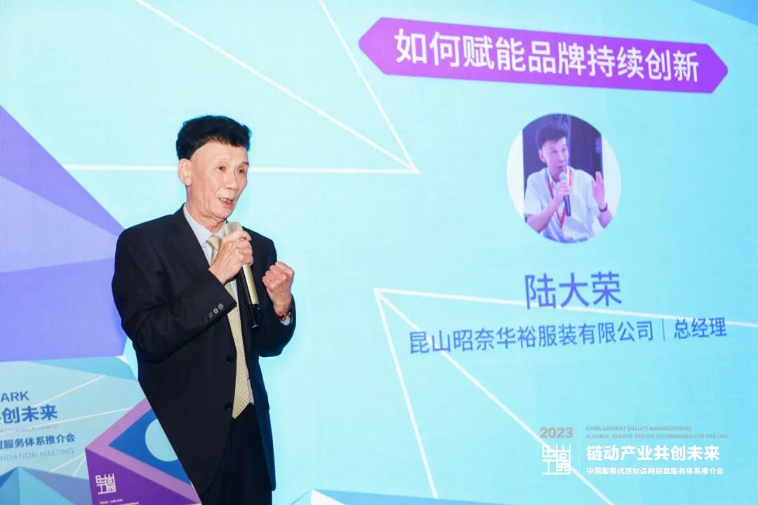 昆山昭奈华裕服装有限公司总经理陆大荣在联盟嘉宾分享环节,昆山昭奈华裕服装有限公司总经理陆大荣作《如何赋能品牌持续创新》的经验交流,他阐述了昭奈华裕做双面羊绒的初心,作为制造企业,优质的产品和保证交货时间是和品牌商合作的重要前提。他觉得,制造企业赋能品牌持续创新,主要体现在四个方面:流行趋势的导向、优质的面料、精致的工艺、合理的报价和良好的服务,希望和品牌商共同把这四项做好,一起拥抱美好的明天。