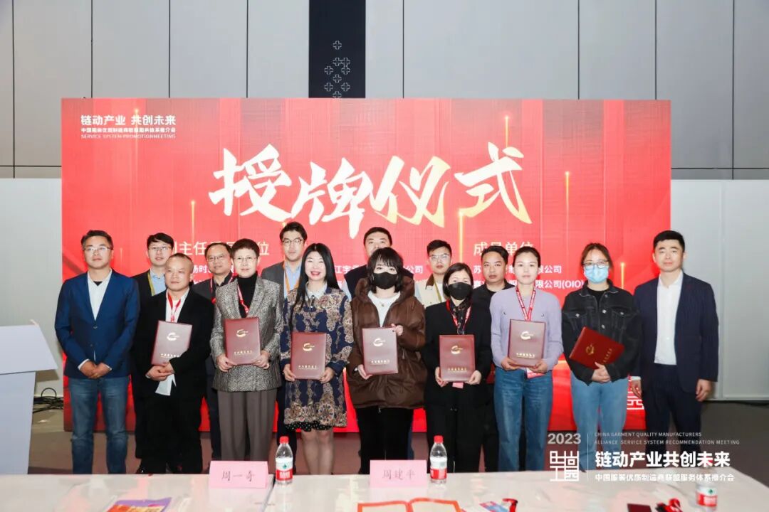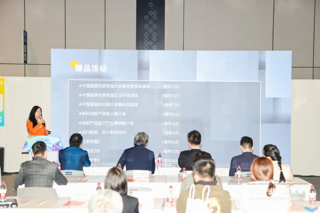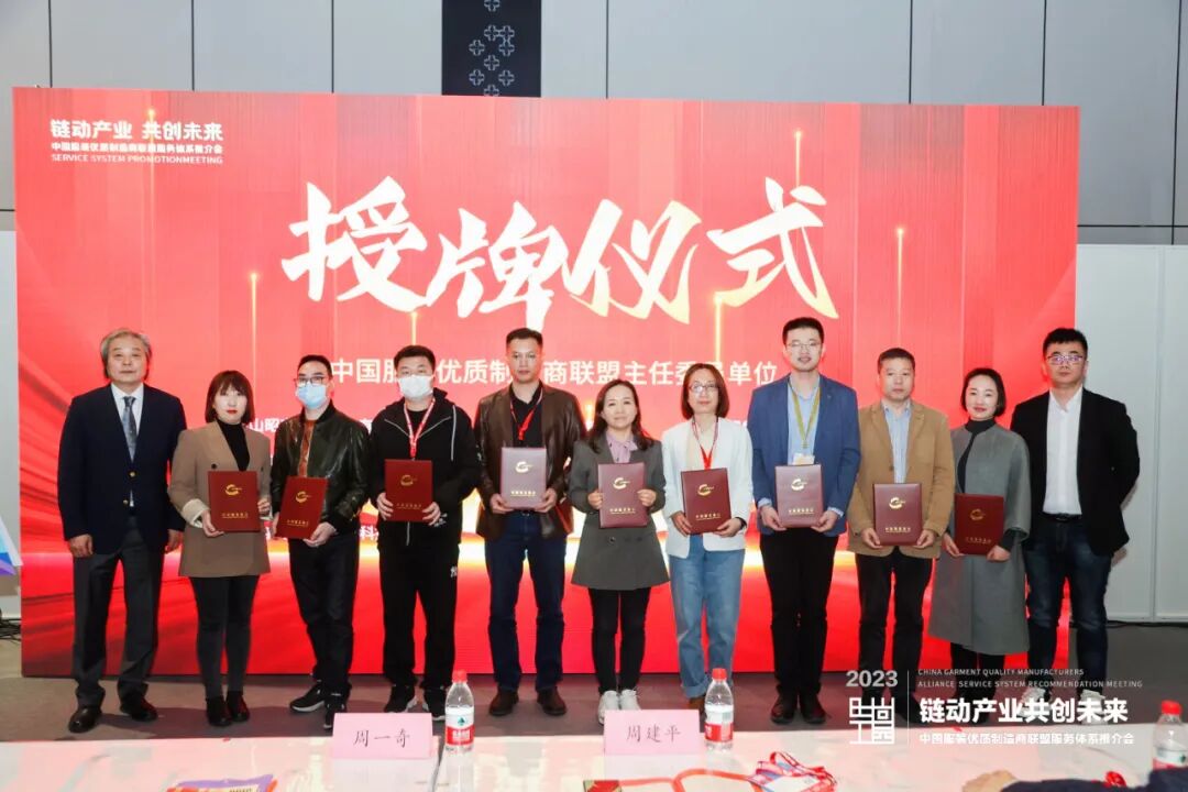 中国服装优质制造商联盟秘书处禹妍整合优势资源,贯通产业协同,搭建创新平台,将行业服务下沉到全国各产业集群,推动中国服装行业高质量发展,是新时期中国服装协会的重要使命与重点工作之一,也是中国服装优质制造商联盟的价值导向和服务职能。中国服装优质制造商联盟秘书处禹妍在联盟服务体系推介中详细介绍了联盟的功能优势、价值服务和精品活动,作为中国服装协会依托行业具有先进生产力和创造力的优秀制造企业成立的行业服务机构,中国服装优质制造商联盟汇集国内重要服装产业集群的百余家优质制造及面辅料企业入驻,形成了中国服装优质制造商的“国家队”。2023年,联盟将以“推动中国服装行业高质量发展”为价值导向,重点开展以产业集群、联盟成员为核心的的综合服务工作,构建世界级产业集群先行示范区创新基地,进一步加强与各产业集群、服装品牌及电商平台的深度对接与合作,着力打造中国服装优质制造国家队!凭借“资源链接、价值创造、合作共赢”的平台优势,2023年,时尚工园又吸引了众多优质制造企业的加入。黑牡丹纺织有限公司、南京苏尧制衣有限公司、青岛邦特生态纺织科技有限公司、上海清扬时装有限公司等23家优质成衣制造企业和优质面辅料供应商在推介会现场进行了授牌仪式。