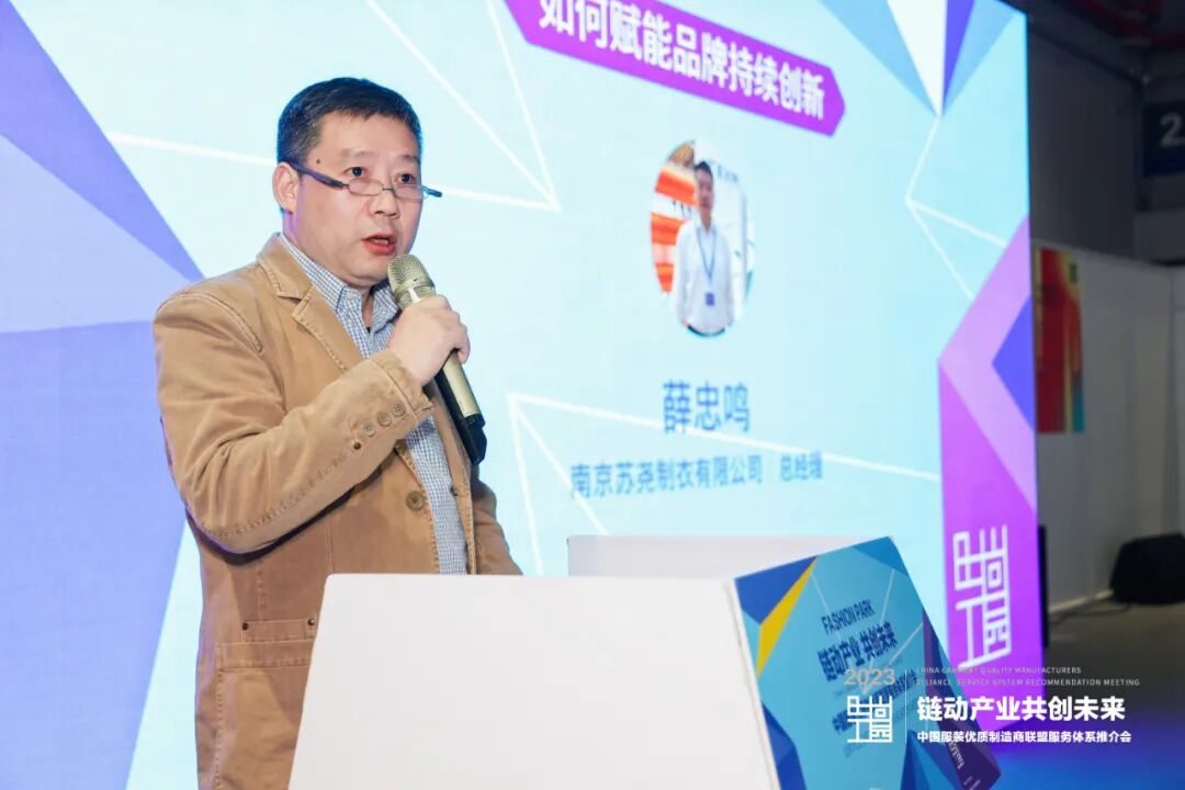 南京苏尧制衣有限公司总经理薛忠鸣南京苏尧制衣有限公司总经理薛忠鸣也以《如何赋能品牌持续创新》为主题,结合企业发展进行了分享,他介绍,根据市场和品牌商的新需求,南京苏尧在不断的探索,不断的优化,不断的进步,在全国建立了四大中心,来赋能品牌发展,希望和品牌商共同成长,也希望时尚工园能组织更多的产业赋能活动,携手合作伙伴共同赢得未来市场。