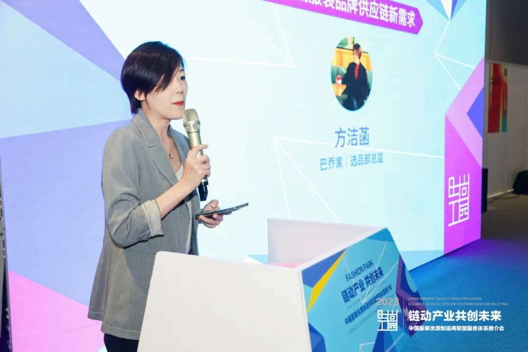 巴乔家选品部总监方洁涵巴乔家选品部总监方洁涵以《新时期服装品牌供应链新需求》为主题详细介绍了巴乔家的发展历程和渠道经验,巴乔家作为一个私域电商平台,核心用户是一二线城市的宝妈用户和亲子用户,在时尚工园平台的帮助下,巴乔家与很多优质供应商达成了战略合作。希望通过本次推介会能寻找到更专业、优质的供应链进行合作。