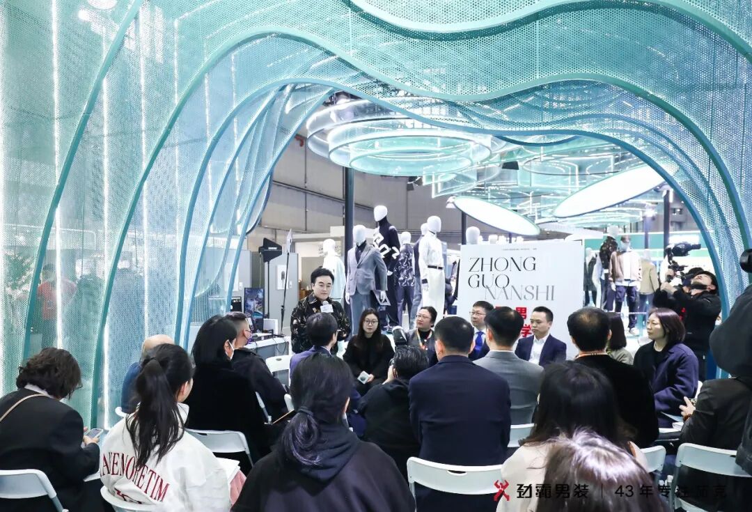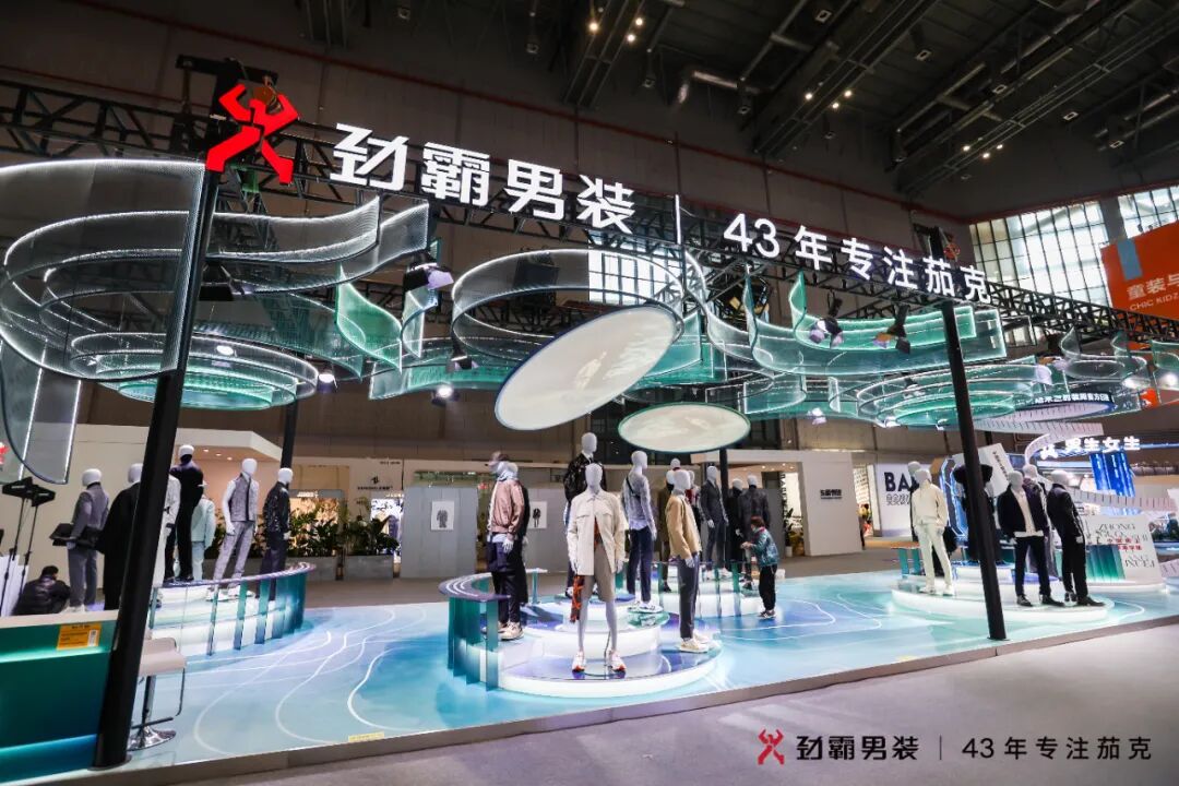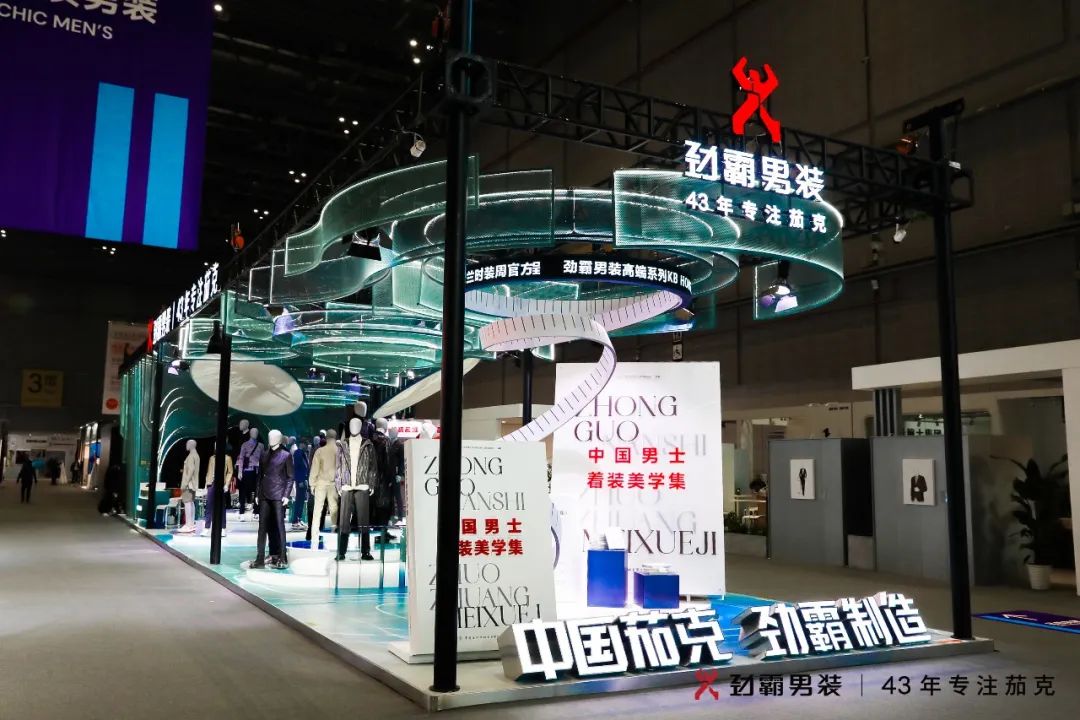 劲霸男装定义中国茄克。1979年,改革开放促发下海经商浪潮,中国经济迎来前所未有的蓬勃发展。时势造英雄,一群顺应时代发展的弄潮儿——创富族群应运而生。1980年,两扇门板做裁床,缝制出劲霸历史上第一件茄克。茄克逐渐替代西装、中山装、绿军装,成为中国创业创富族群的重要表征。劲霸茄克为积极拼搏、务实敢为的中国男人带来了自信、稳重、得体,又不失活力的着装形态。劲霸男装创制的商闲皆宜的茄克版型逐渐成为中国茄克的独特属性,43年劲霸男装定义中国茄克。东方美学加冕中国茄克。在国家综合实力提升和文化自信的背景下,劲霸男装深耕中国文化、东方美学,持续以“中国符号”激发“中国茄克”的当代性和生命力以获得与中国男性更大的共鸣和价值感。近年来,在设计研究基础上有了更深层次的思考和拓展,对传统文化符号的理解和运用,从技艺的融合,到内蕴的传达,再至意境的创造,结合国际设计范式与现代工艺再解构、再碰撞、再升华,以东方美学加冕劲霸茄克,赋予劲霸茄克更为国际化、时尚化、艺术化、内容化的叙事表达。中国茄克 劲霸制造。CHIC 2023(春季),劲霸男装延续东方美学的现代化表达,品质男装展区主展整体取中国传统文化中“高山流水”意境做为视觉设计概念,馆内四组功能区则以极具现代设计感的流线型框架串连;展区内采用唐朝盛行的“青绿山水”画法,以石蓝、石绿等矿物颜料为主,表现山石的肌理脉络和明暗变化,即便在展会方寸之间,也要呈现山水之远。劲霸男装顺应时代之势,积岁月洪流,汇聚成河,奔流出海,浩浩荡荡谱写一路中国茄克风华。馆内四处陈列区分别展示着劲霸男装秀款茄克,新商务、时尚商务、假日三大系列商品,高端系列KB HONG米兰时装周秀款,从历史文化到艺术美学再到国际时尚视野,汇聚起劲霸茄克实力的一座座高峰。
