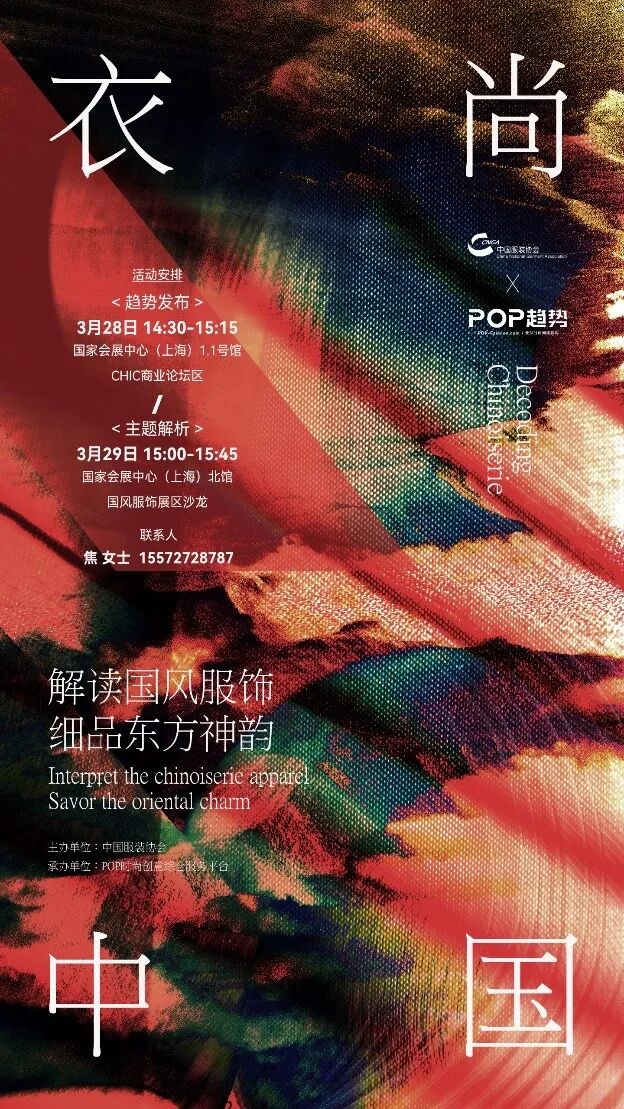 近几年的流行趋势中,国风成为一种国际的文化浪潮,一种自信的生活方式,是审美的自我表达。本次「衣尚中国」趋势发布活动致力于将中国文化、传统元素与当代潮流时尚美学的融合,将中华文化基因融入当代服饰设计当中,深入探讨国风文化在当下时尚生活中的美学表达,把握国风服饰在消费市场中的流行动向,启发中华传统优秀服饰文化在设计与研发理念中的创新与应用,展现成衣时尚和中国文化的融合之美。