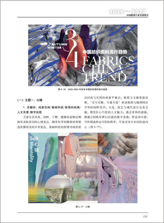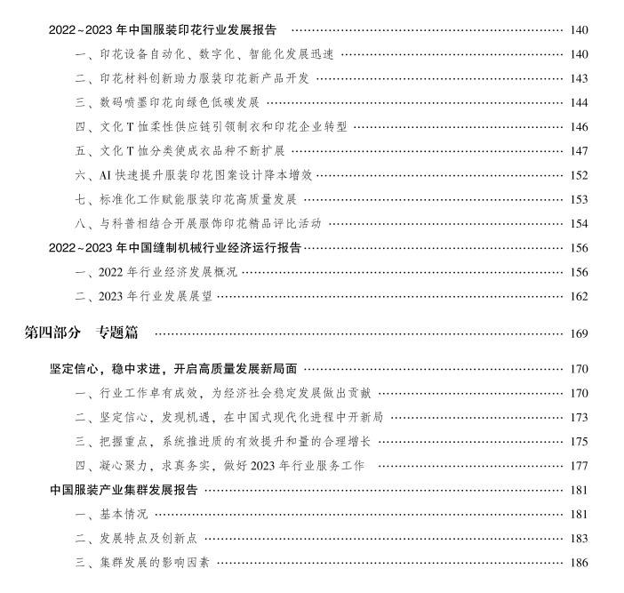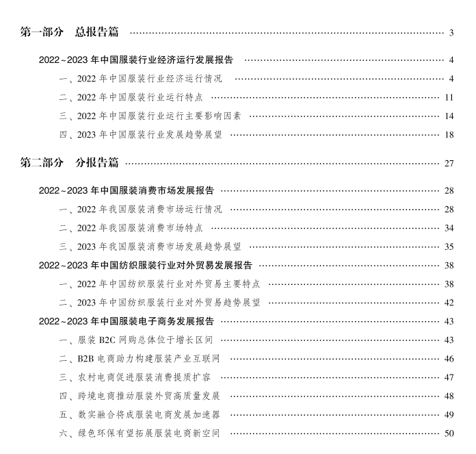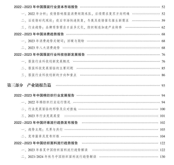 分报告篇包括2022-2023年中国服装消费市场发展报告、2022-2023年中国纺织服装行业对外贸易发展报告、2022-2023年中国服装电子商务发展报告、2022-2023年中国服装行业资本市场报告、2022-2023年中国消费趋势报告、2022-2023年中国服装行业科技创新发展报告。