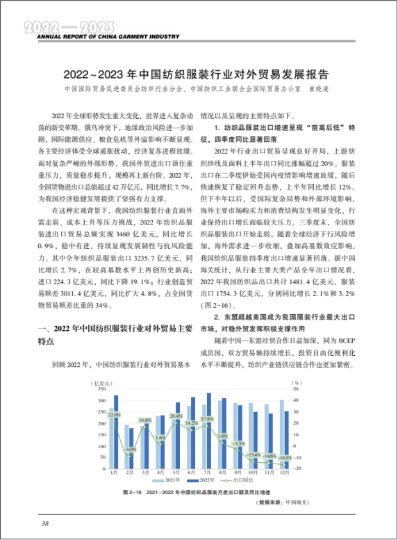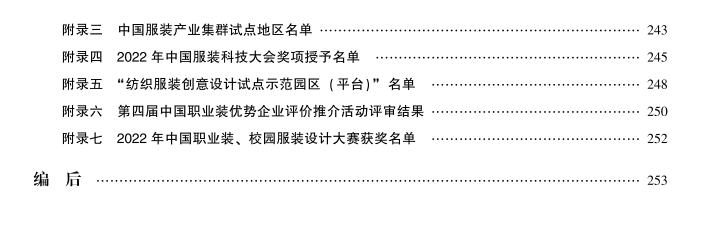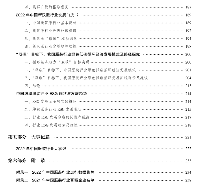 专题篇收录了《坚定信心,稳中求进,开启高质量发展新局面》、《中国服装产业集群发展报告》、《“双碳”目标下,我国服装行业绿色低碳循环经济发展模式及路径探究》、《中国纺织服装行业ESG现状与发展趋势》。