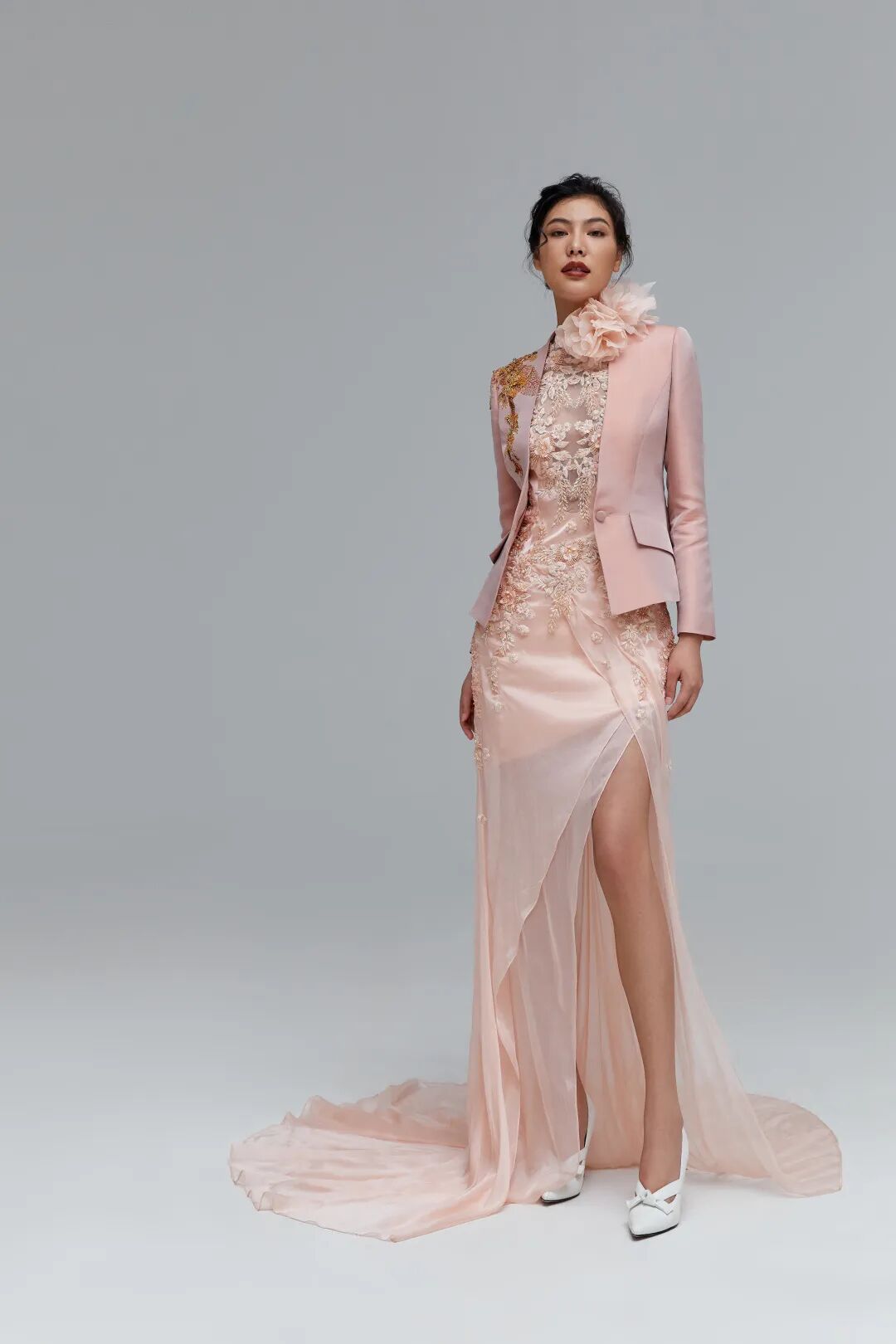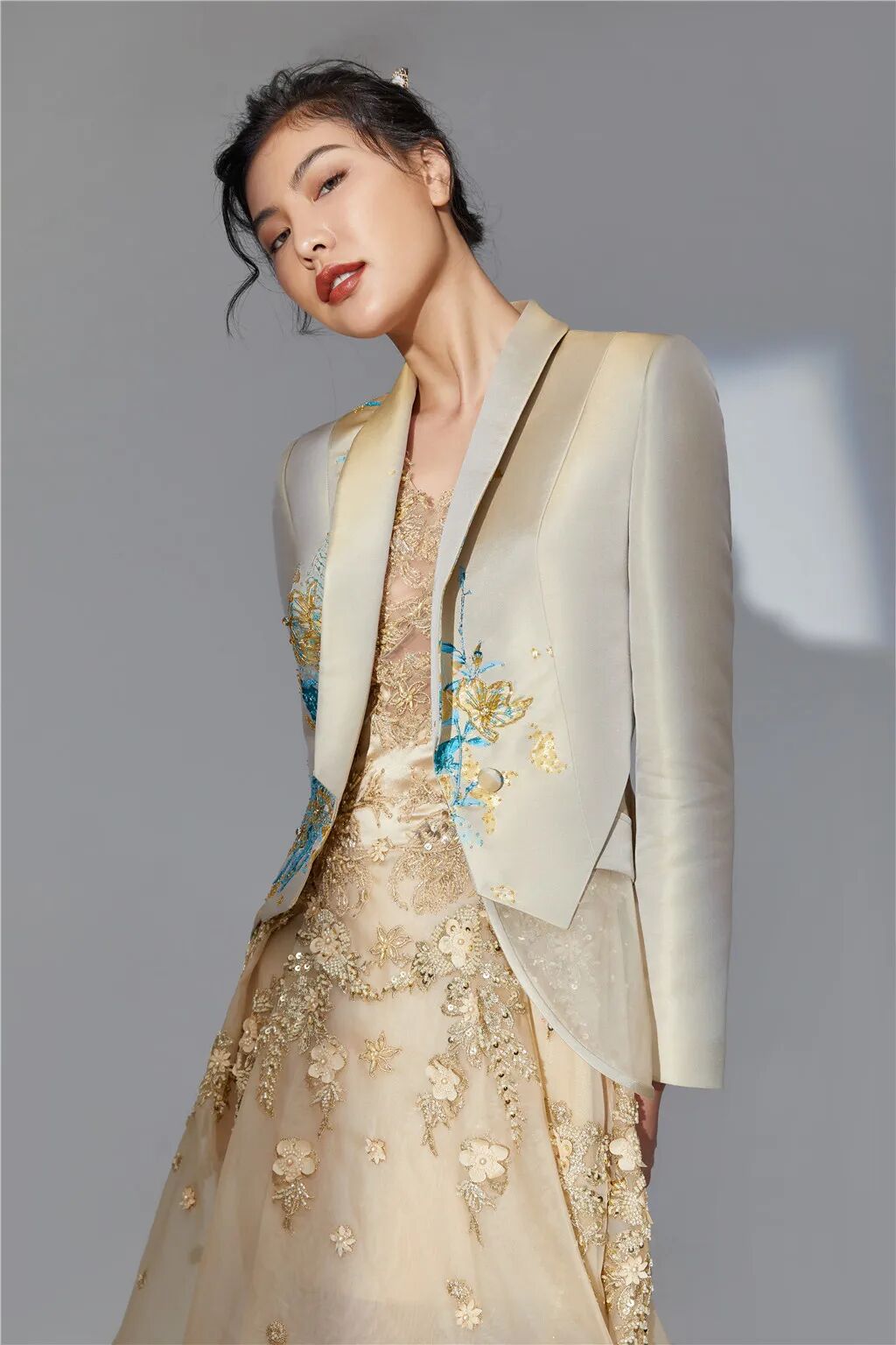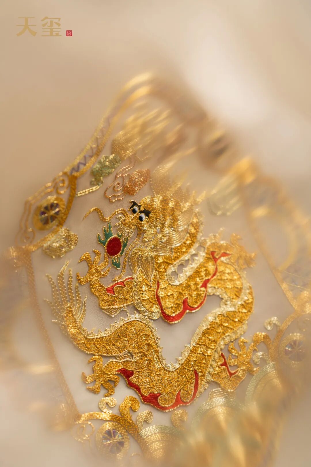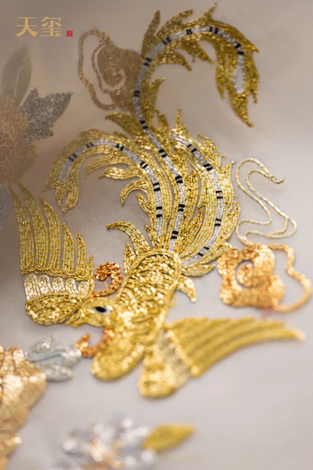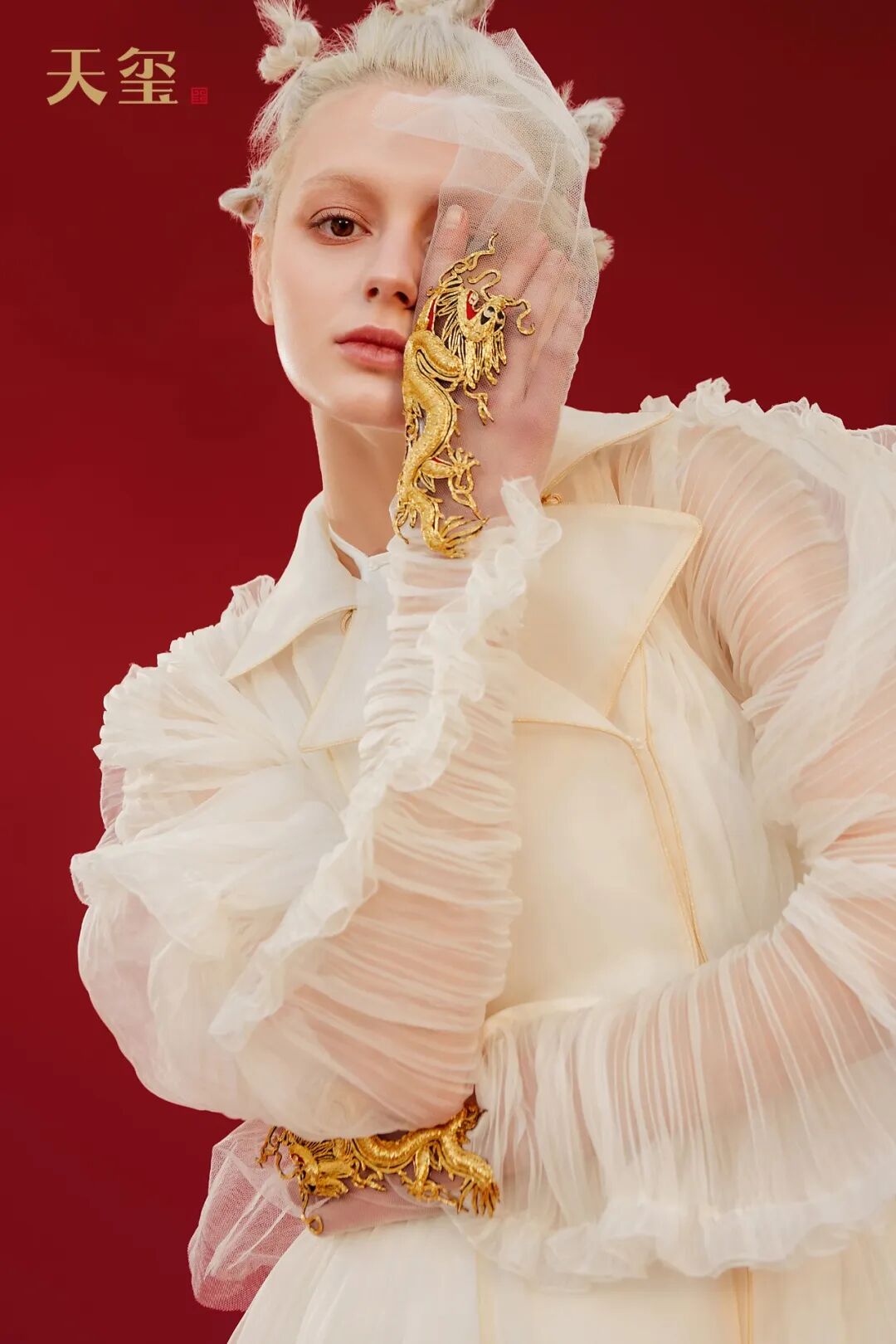 经过近10年的探索积淀,天玺已经形成了自己的风格特征,在工艺、品质、创意表达等各个维度都力求匹配“中国礼服”的文化定位,做到神形聚合。“我们会在一场新品发布系列中,运用12种以上的苏绣技艺,盘金绣、打籽绣、滚针绣、平绣、绕针绣,以及几乎失传的“扁金绣”;纹样表达上,除了创新应用中国传统吉纹,还会考究十二章纹、历代龙纹等经典纹饰,从服饰形制到细节呈现,古今融汇。”谈及品牌如何讲好中国故事,天玺表示首先要坚定文化自信,从我国上下五千年的文明史中探寻文化源流,追溯思想和精神的核心力量,找到优秀传统文化的内核,用创新能力去传而承、融而新,演绎出时尚气韵的文化之美。
