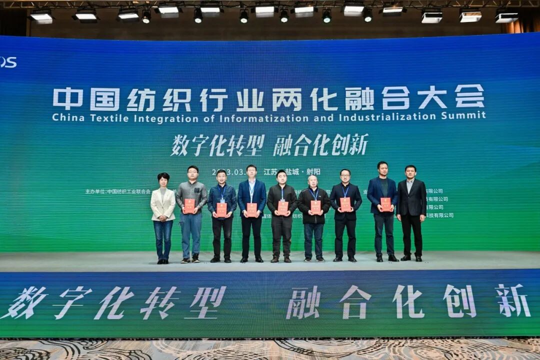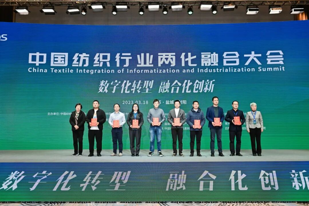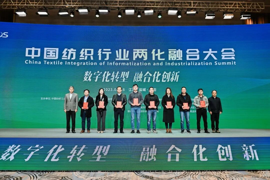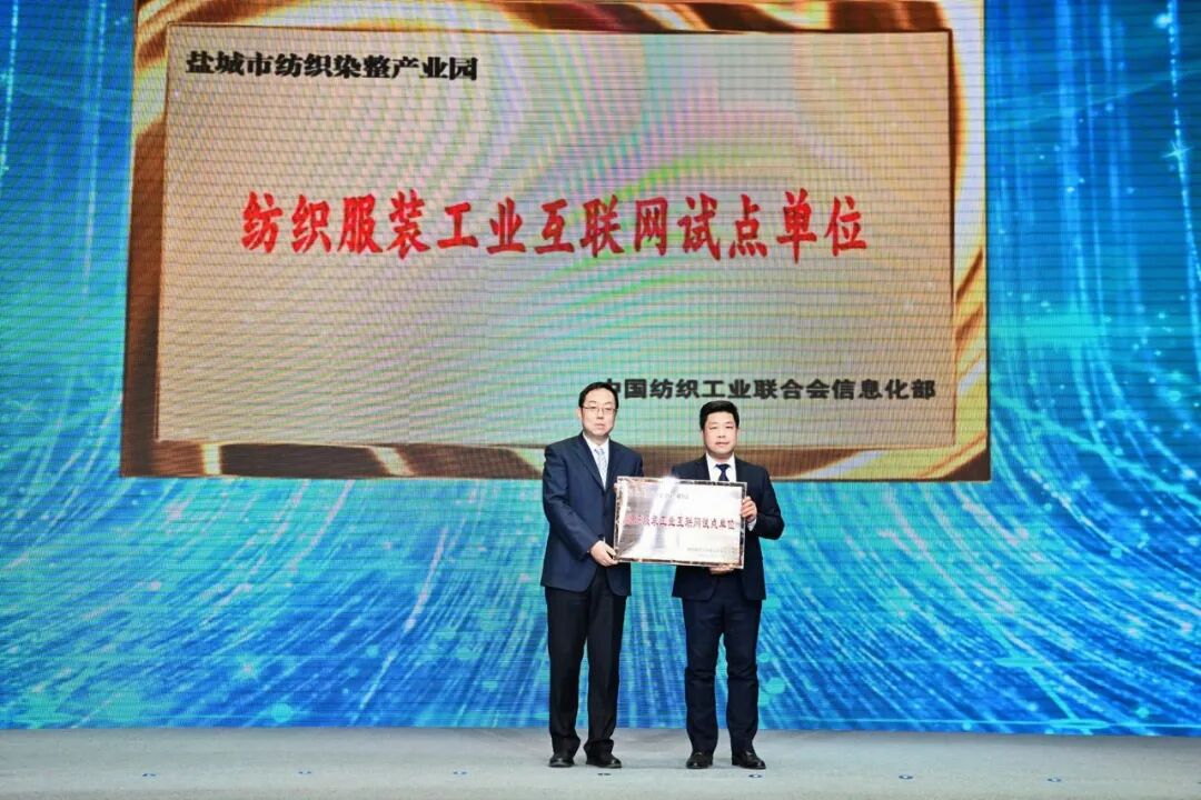 中国纺联信息化部纺织行业数字化转型首席专家翟燕驹向盐城市纺织染整产业园党工委书记兰清华授牌“纺织服装工业互联网试点单位”。