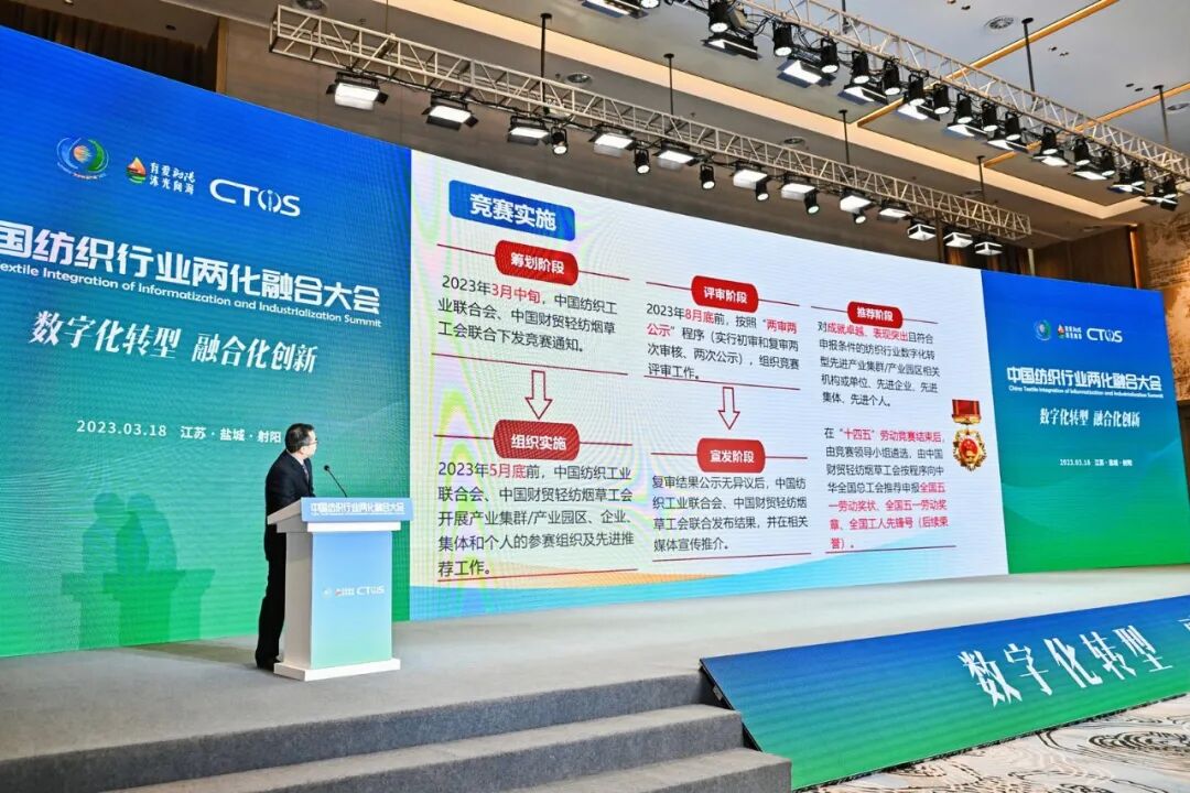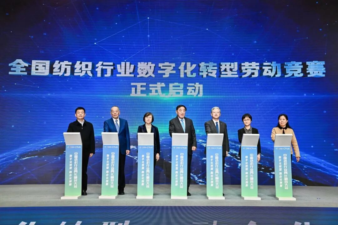 为贯彻国务院《“十四五”数字经济发展规划》,落实工信部《“十四五”信息化和工业化深度融合发展规划》、中国纺联《纺织行业“十四五”发展纲要》和中华全国总工会办公厅《关于深入开展“十四五”全国引领性劳动和技能竞赛的通知》相关要求,中国纺织工业联合会、中国财贸轻纺烟草工会决定联合开展全国纺织行业数字化转型劳动竞赛。中国纺联原会长王天凯、秘书长夏令敏,工信部消费品工业司一级巡视员曹学军,中国财贸轻纺烟草工会二级巡视员吕杰,中国纺联原副会长杨纪朝,江苏省工信厅副厅长黄萍,盐城市委常委、秘书长薛盛堂等嘉宾共同按下劳动竞赛启动键。