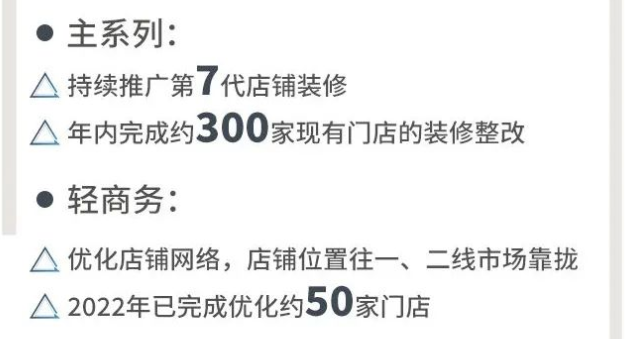 为继续提升LILANZ品牌形象及消费者购物体验,集团持续推广主系列的第七代店铺形象,2022年完成约300家现有门店的装修整改。同时对包括LESS IS MORE在内的店铺网络进行优化,往一、二线城市搬迁,2022年已完成优化约50家门店。