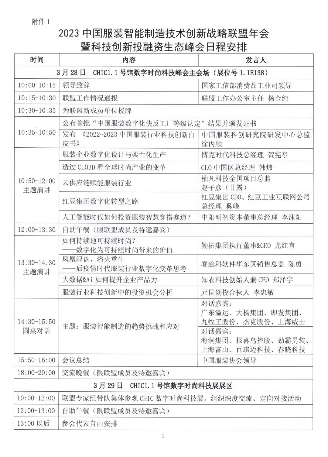 附件1:2023中国服装智能制造技术创新战略联盟年会暨科技创新投融资生态峰会日程安排