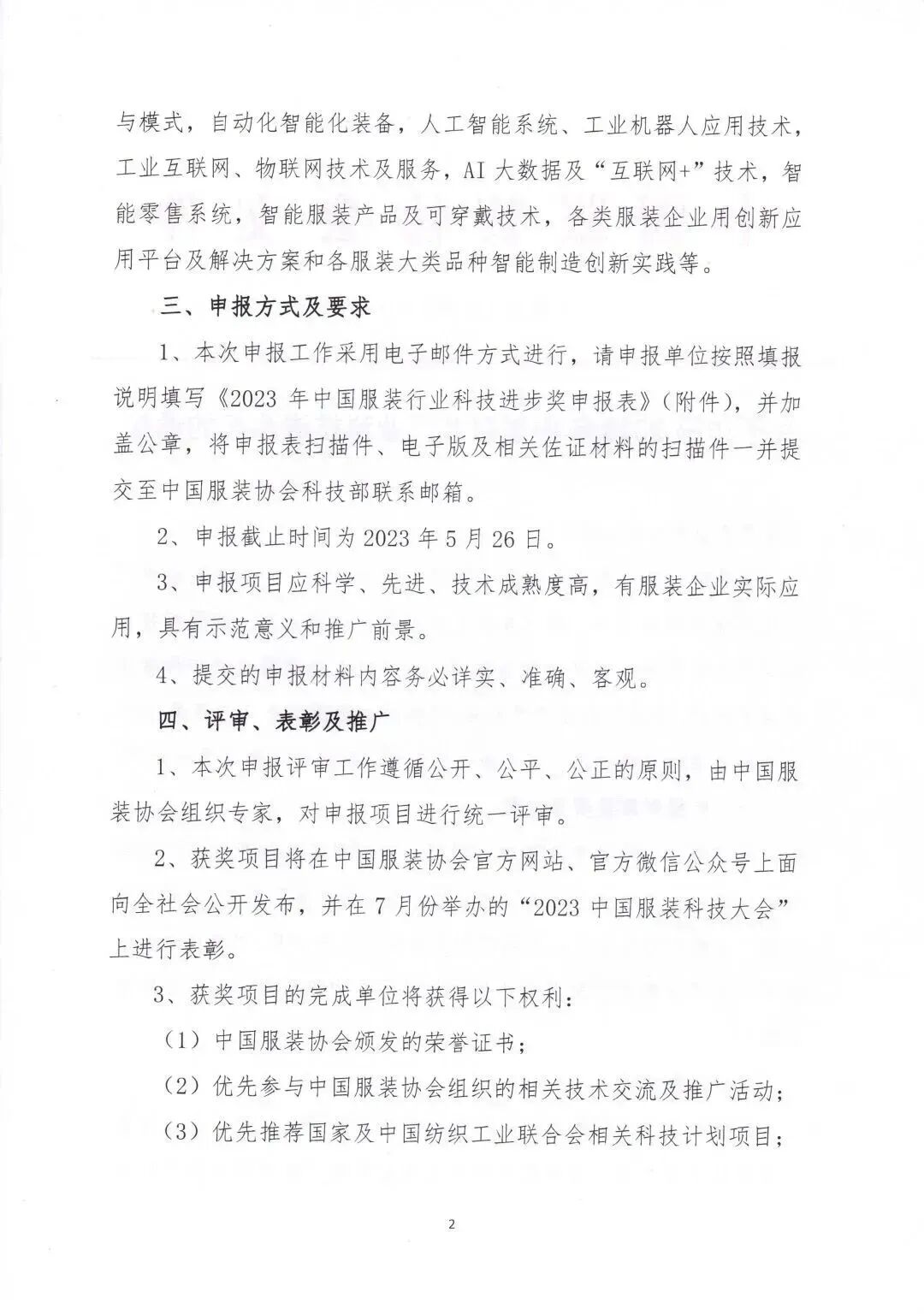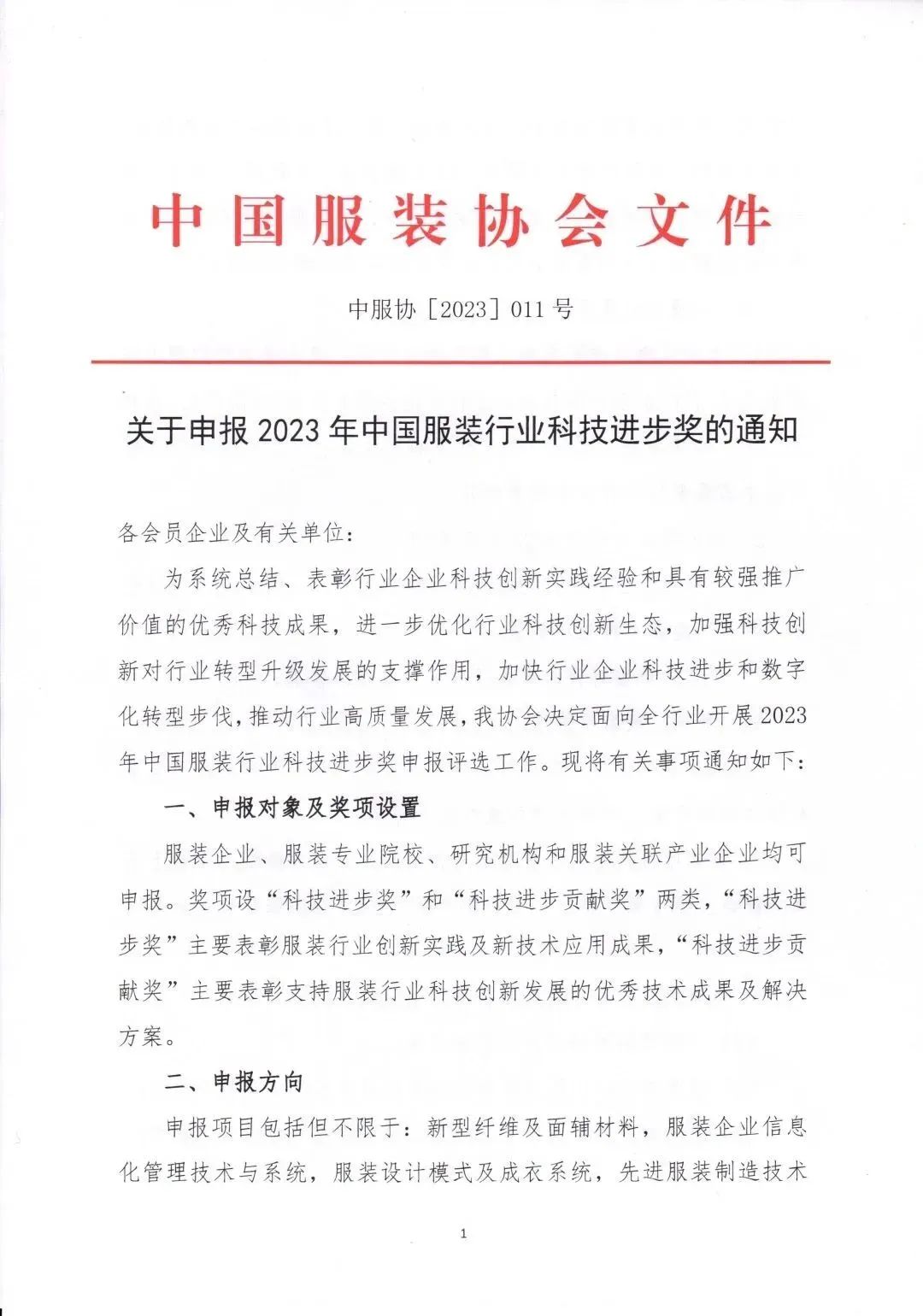 为系统总结、表彰行业企业科技创新实践经验和具有较强推广价值的优秀科技成果,进一步优化行业科技创新生态,加强科技创新对行业转型升级发展的支撑作用,加快行业企业科技进步和数字化转型步伐,推动行业高质量发展,我协会决定面向全行业开展2023年中国服装行业科技进步奖申报评选工作。现将有关事项通知如下: