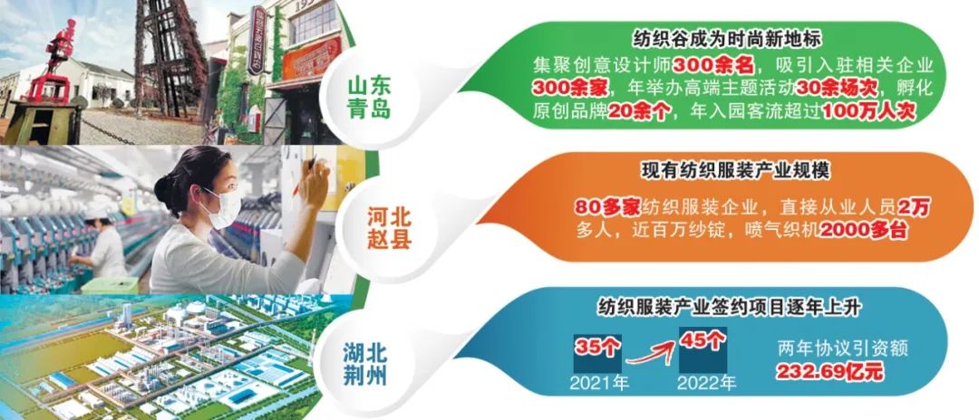 目前,青岛纺织谷对标“三品”战略,深耕纺织服装创意设计和时尚产业服务贸易平台建设,通过搭建产业、金融、商务赋能平台,跨界融合相关时尚资源,集聚创意设计师300余名,吸引入驻相关企业300余家,年举办时尚发布、商贸会展、时尚节庆、品牌营销等高端主题活动30余场次,孵化原创品牌20余个,年入园客流超过100万人次。
