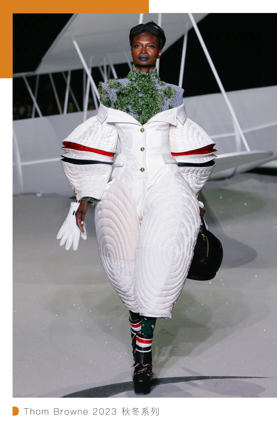 自 2017 年将女装系列发布秀场搬到巴黎的 Thom Browne,于情人节之际回归主战场。或许是才喜提 CFDA 主席任命,设计师 Thom Browne 希望借此机会做出点“成绩”,硕大的戏剧化廓形、超出常规的肩线、没有规则的创意拼接,还有充满童趣却也不失乖张的印花设计,的确赚足了眼球和话题。