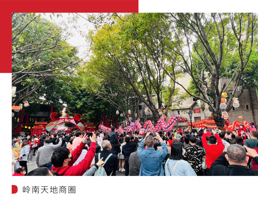 春节期间,岭南天地商圈举办了佛山古镇灯会、舞龙舞狮、财神派利是、福禄寿巡游、非遗年俗巡游等大量现场装饰和活动,吸引了大批本地市民和外地游客到访。