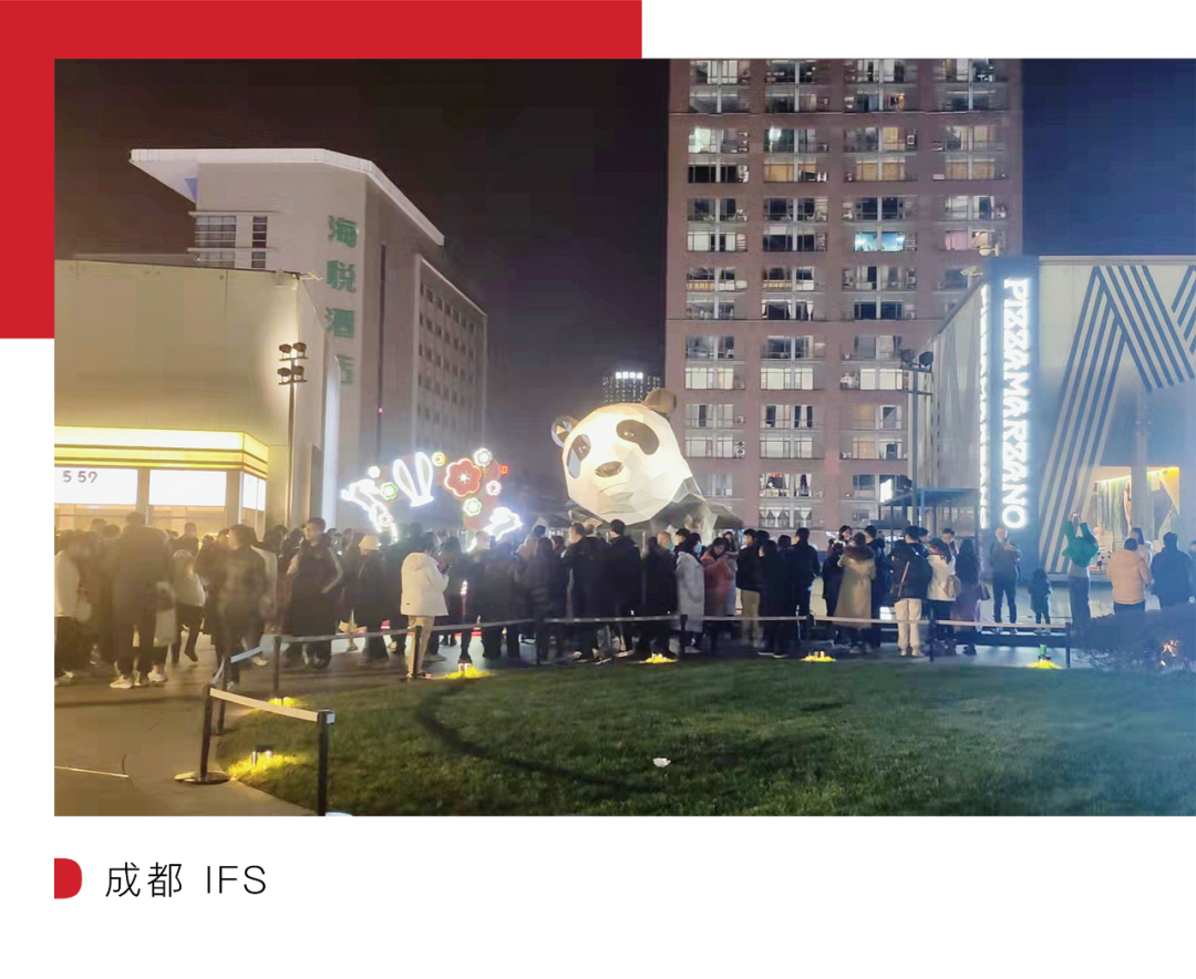 此外,根据成都 IFS 数据显示,伴随着场内丰富的活动推出,新春假期期间成都 IFS 全场的客流、车流、销售也都较之前有明显增长,春节期间场内单日最高客流增幅超 80%,7 天累计客流近百万。最直观地表现,或许就是地标熊猫“I am here”面前又排起了前来同框合影的长队。