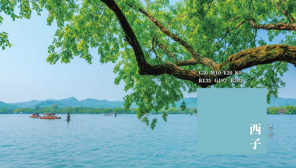 从“欲把西湖比西子”中取得“西子色”,像西湖水一样的绿色,这抹天赋的清新,用来修饰过酒色,也用以修饰服饰色彩。