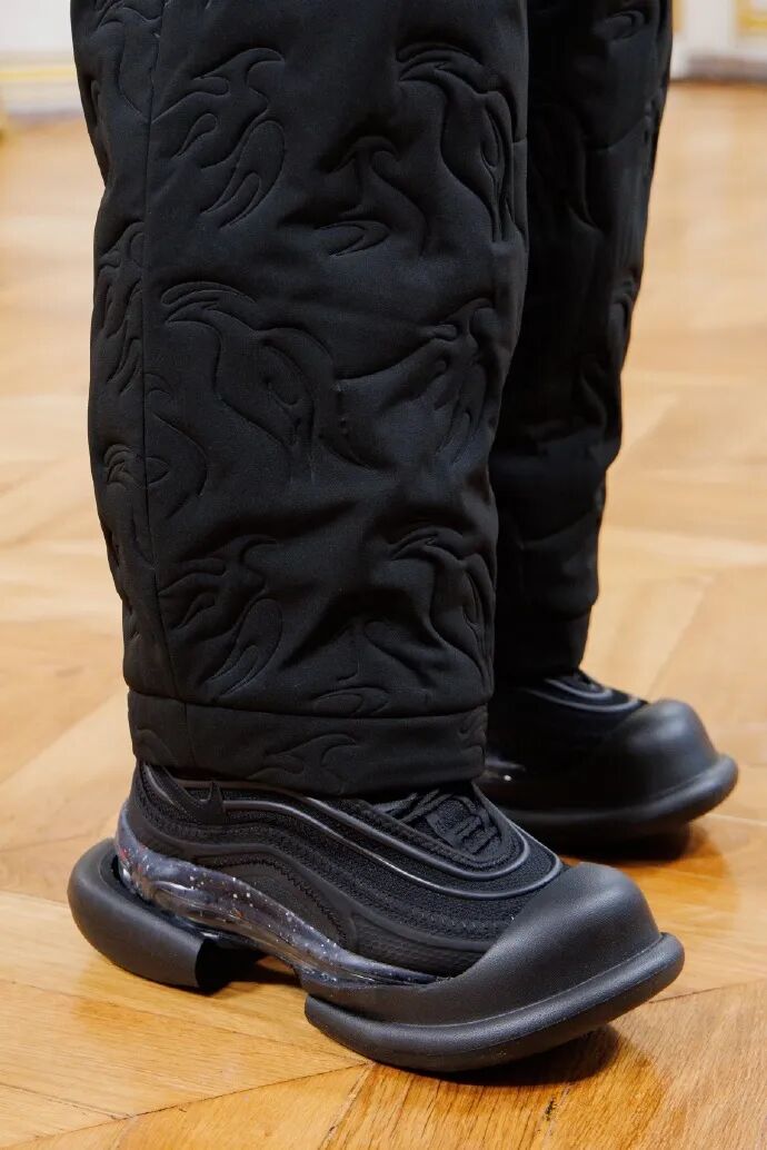 Feng Chen Wang 还发布了与 Nike 的联名款鞋履。设计师将 Nike 的 Air Max 97等鞋款用Feng Chen Wang 标志性图案凤凰与经典切割解构方式重新演绎,呼应了“相遇相缝”主题。