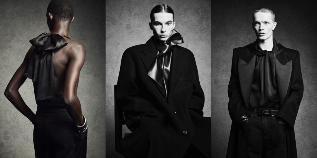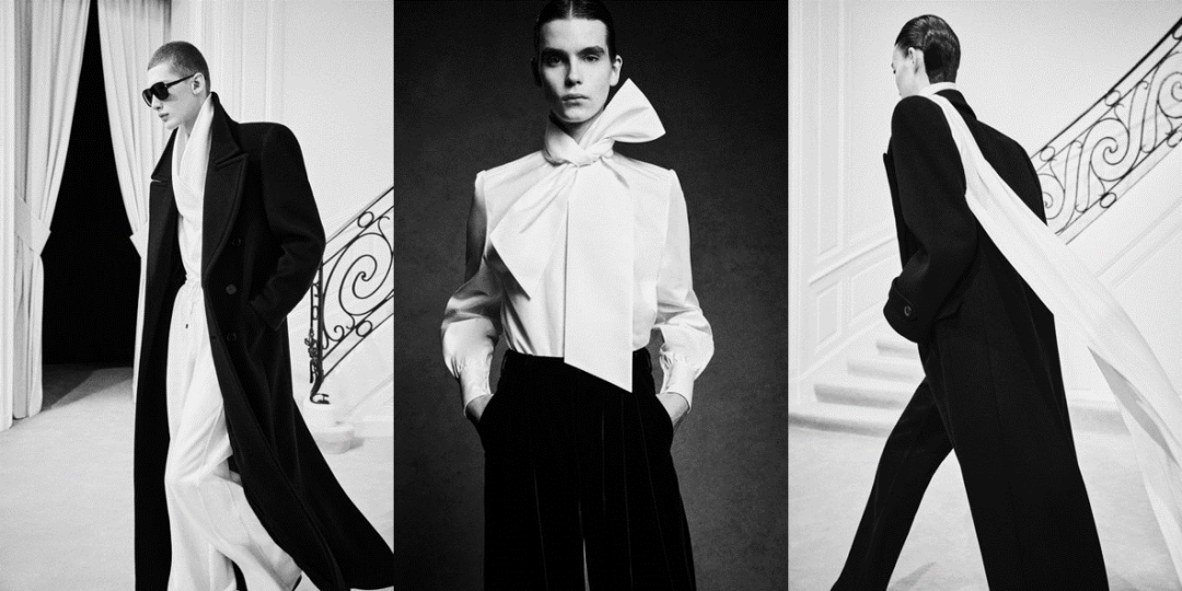 Saint Laurent 2023/24秋冬男装系列以黑白两色为主色调,延续品牌一贯的“性别流动对话”,展现品牌最为知名的中性风格。Saint Laurent在结构化的廓形与流畅的线条的基础上融入更多女装元素,这一点在服装比例和裹身理念上体现得十分明显,更显精致优雅。