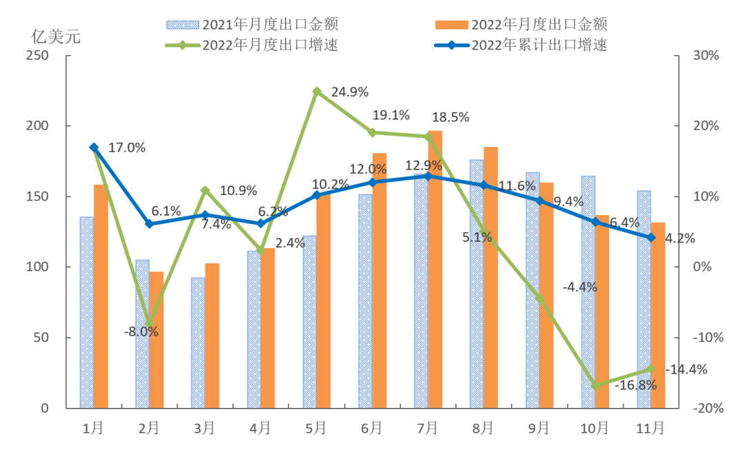 图3 2022年1-11月我国服装及衣着附件出口情况