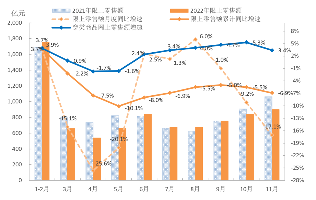 受国内疫情多地散发、需求减弱等因素影响,我国服装内销市场明显下滑,5月限额以上单位服装类商品零售额累计降幅达10.1%。自6月开始,受益于各级政府高效统筹疫情防控和经济社会发展,以及促消费政策发力显效,服装内销呈现改善恢复趋势,连续4个月降幅收窄。10月和11月,由于疫情大面积反弹,居民外出购物、社交活动减少,服装内销市场再次受到冲击。根据国家统计局数据,1-11月,我国限额以上单位服装类商品零售额累计8294.6亿元,同比下降6.9%,降幅比上半年收窄1.1个百分点,比2021年同期下滑23.3个百分点;11月当月限额以上单位服装类商品零售额同比下降17.1%。实体销售大幅下降,根据中华全国商业信息中心统计,1-11月,全国重点大型零售企业服装零售额和零售量同比分别下降12.3%和16.2%,11月当月服装零售额和零售量同比分别下降29.0%和26.0%。线上服装零售增速明显放缓,1-11月穿类商品网上零售额同比增长3.4%,增速比上半年加快1.0个百分点,比2021年同期放缓7.7个百分点。