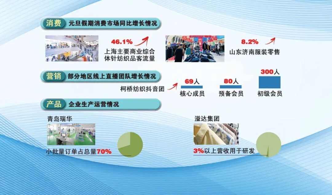 “这件羽绒服做工很细,做了包边包条,衣服的颜色也是今年比较流行的湖水绿……” 广州白马服装市场(以下简称“白马”)主播余雄生正在店铺里进行直播,详细介绍店铺的品牌和主打款式服装。仅仅一个上午的时间,他就介绍了近200款衣服。“直播带货”已经成为当下的一种趋势,不少纺织服装专业市场、纺织服装企业正通过直播焕发新活力,也为刺激消费增长带来新亮点。从事服装行业七八年,余雄生深知广州白马服装市场无论从面料选购、产品成本控制、设计水平都非常有优势。“2023年元旦假期,我一直在直播平台上忙碌着,只为帮助商户们冲刺新年消费旺季。” 他说。在江苏盛泽,不少面料生意人已经开始习惯通过网络直播招徕客户。“我们都是土生土长的盛泽人,在纺织行业干了20多年,因为志同道合走到一起。我们萌生了通过抖音平台来推广盛泽面料的想法,同时也想为提升盛泽纺织产业知名度出点力。”张培玉是布宝宝传媒服务平台的主播之一,经营个人抖音号。“我们有一个做纺织水印花面料的客户,由于前期帮他做了一期抖音视频推广,几个月下来,他已经陆续接到2000万元左右的客户订单。”近日,该服务平台所属的苏州布宝宝文化传媒有限公司负责人表示,短短几个月下来,已经为纺织圈不少客户促成了订单。“2023年撸起袖子加油干!”柯桥纺织抖音团发起人之一、绍兴柯桥天御纺织有限公司负责人郭靖显得很有信心。“纺织行业的销售方式正发生着翻天覆地的变化,公司开始运营抖音直播账号以来,线上获客率已经远超线下,成为工厂主要的获客渠道。”郭靖介绍说,“平台不仅为公司招揽到了80吨的面料订单,还吸引了不少优质客户,其中不乏高质量的加工厂和服装品牌公司。持续发布的小视频,使企业每天都能够收获超过20个询盘。通过做成服装成衣的形式进行售卖,面料的附加值提高了。”柯桥纺织抖音团团长、绍兴柯桥品诺纺织品有限公司创始人张春华表示,目前,柯桥纺织抖音团在中国轻纺城纺织圈的影响力与日俱增,已吸引了本地诸多纺织行业热门抖音IP加入。据了解,目前团队已发展核心成员69人、预备会员80人、初级会员300人。郑州银基商贸批发市场也已深谙此道。“我们有跟抖音合作,探索一些新的销售模式,比如云逛街、云探店,目前我们两个账号也累积了近100万的粉丝。”张敬敏说,已经有不少商家今年想与银基合作,尝试直播带货。此外,银基也在想尽各种方法打通渠道,帮助商家拓宽销路。银基定制开发了自己的会员系统,把日常来采购批发和零售的顾客纳入会员体系,为消费者和商家之间架起一座沟通的桥梁,做到有的放矢。不断推出适应市场需求的产品,是企业竞争市场的能力体现。溢达集团在近日举办的2024春夏产品发布会上,推出了一批春夏面料新品,这些新品具有适用于不同场景的功能性,如凉爽触感、柔软轻磨毛和四面弹等。溢达集团首席科学家、研发总监张玉高表示,公司每年投入3%以上的营业收入作为研发费用,在棉花育种、绿色生产、智能制造、新产品开发、环境保护等多个领域探索纺织行业前沿课题,致力于解决纺织服装行业共性技术问题。近几年,在疫情影响下,溢达集团及时调整经营策略:由原来的以出口为主,调整为国内国外双循环,并顺势推动集团产业转型升级;大力推广和发展自有品牌“派”和“十如仕”;进一步推动生产过程的智能化精益化改造,以及环保可持续发展等,将多年来积累的科技优势转化为集团的新业务。“在充满个性化的市场需求下,消费者对于款式和面料的需求都各不相同,我们之前单一的大批量、同一化的产品竞争力明显不足。”青岛瑞华集团有限公司(以下简称“青岛瑞华”)总经理程红升表示,公司正在积极调整,主动迎合市场新需求。“之前接的外贸订单都在1万件以上,但是近期接到的一批新订单,大的有3000件,最小的只有50件。这种小批量的订单,现在基本上占到了我们订单总量的70%以上。去年全年公司产值同比增长20%以上,小订单的作用可不小。” 程红升说。“和过去三年的反反复复不同,2023年产业将迎来长期复苏。”帽仕汇创始人、南通市富美帽饰博物馆馆长孙建华很有信心地表示,他已经做好了充分准备。因为从2022年开始,孙建华尝试从C端转向买手店、专业店,并扩充品牌定位风格,输出多品牌、设计、供应链。2023年,他更加确信了这一模式对企业的裨益。同时,增加跨界合作,开发国际市场,让C端、买手店、专业店,线上、线下,国外、国内形成矩阵的多元立体发展将成为新发展模式。吴江明斯克贸易有限公司位于江苏盛泽,常年经营纺织品外贸进出口业务。疫情期间,公司业务虽然受到了国内物流和供应链受阻、美元贬值、海运费高企等多重因素的影响,但是其主要的出口市场东南亚一直保持业务稳定。公司总经理吴长明在接受《中国纺织报》记者采访时,给记者列举了2019年至2022年公司出口结构表。他表示,四年间,公司出口的产品种类涉及面料、服装、防疫物资等,从抗菌针织面料到四面弹面料等,公司一直与品牌企业客户保持紧密沟通,从面料下单、组织生产再到出货等及时满足客户需求。谈到2023年的发展规划,多家企业负责人表示,未来纺织服装企业要转变观念,向直播电商、跨境电商等新模式、新业态发展,同时要重点做好产品,打造好自己的品