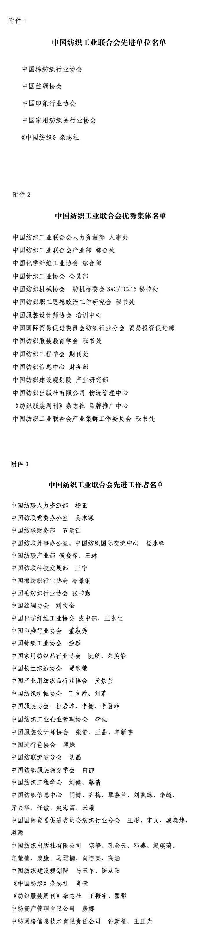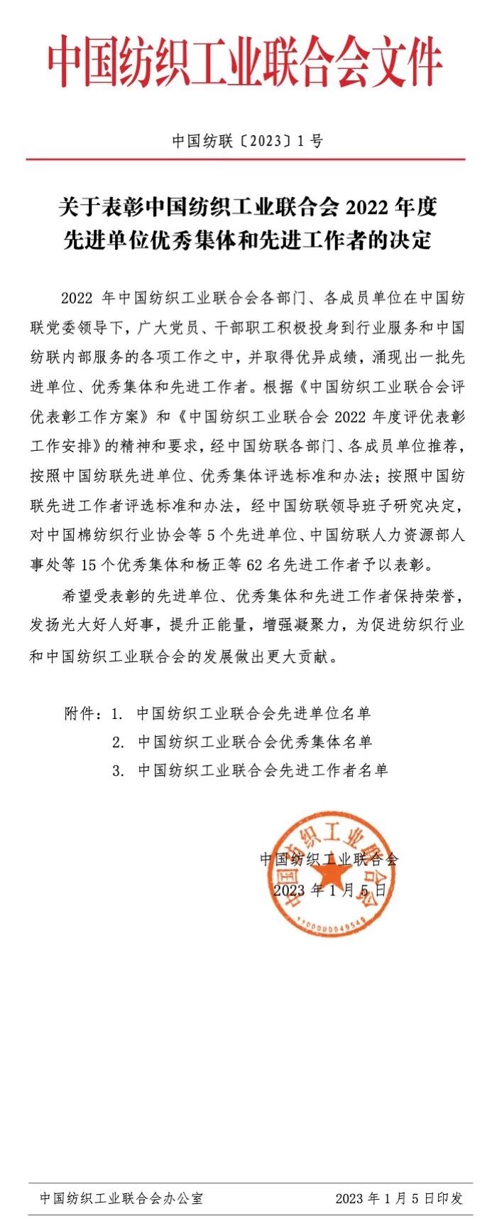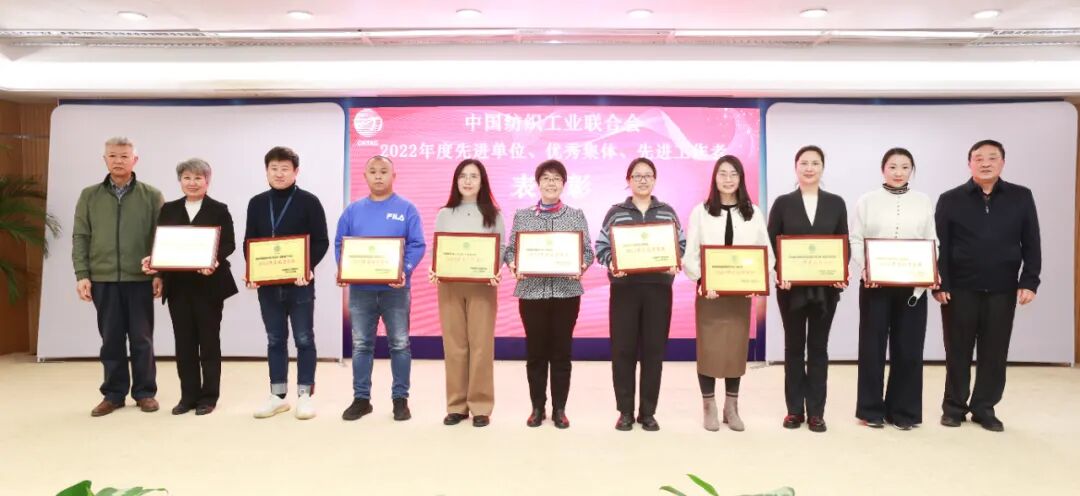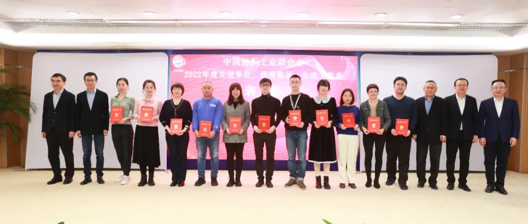 随后,大会进入表彰环节,中国纺联副会长陈大鹏宣读《关于表彰中国纺织工业联合会2022年度先进单位优秀集体和先进工作者的决定》。会上举行了颁奖典礼,中国棉纺织行业协会等5家单位获先进单位称号,中国纺联人力资源部人事处等15个部门获优秀集体称号,杨正等62名同志获先进工作者称号。